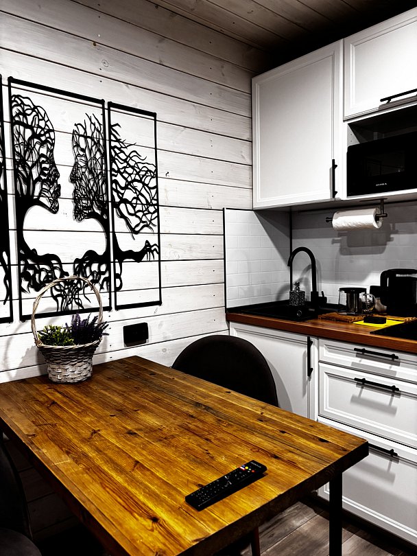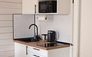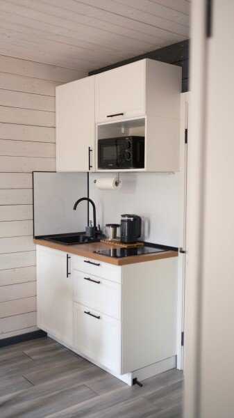 - мини-кухня со всем необходимым (микроволновка, холодильник, варочная панель, посуда);