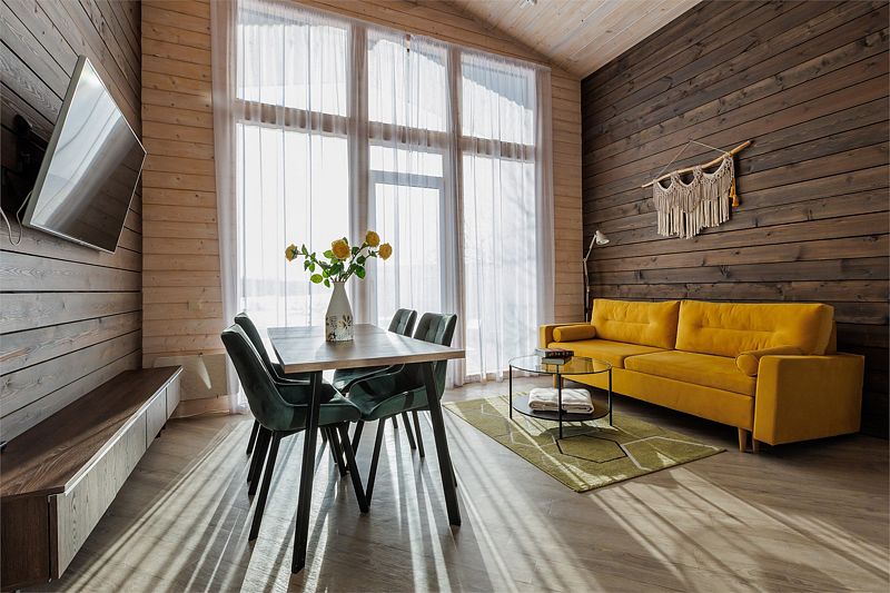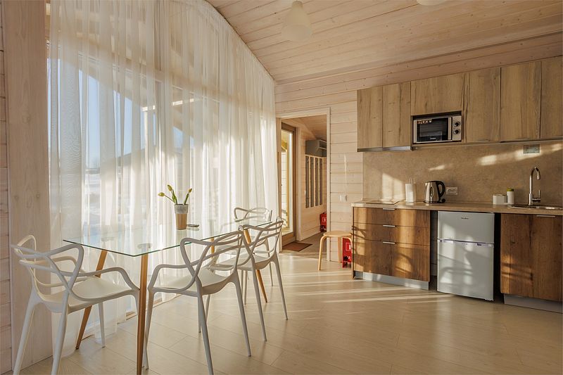 В домах обустроены две спальни, в каждой установлена кровать размера king size, имеется собственный санузел. Между спальнями - гостиная с кухней и обеденной зоной, посудомоечной машиной, холодильником, мягким диваном и телевизором.