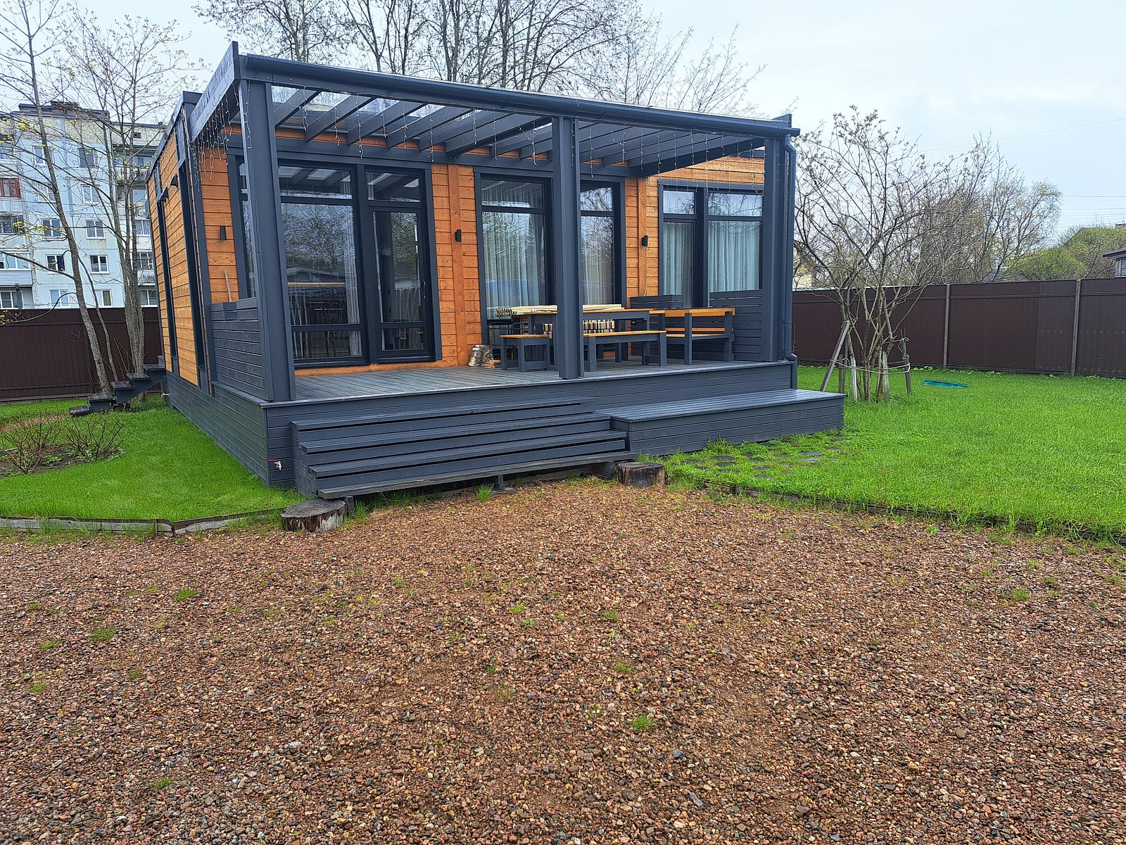 Дом с панорамным остеклением во всех комнатах, две спальни, открытая терраса и кухня-гостиная. Дом рассчитан на комфортное проживание 4 человек.