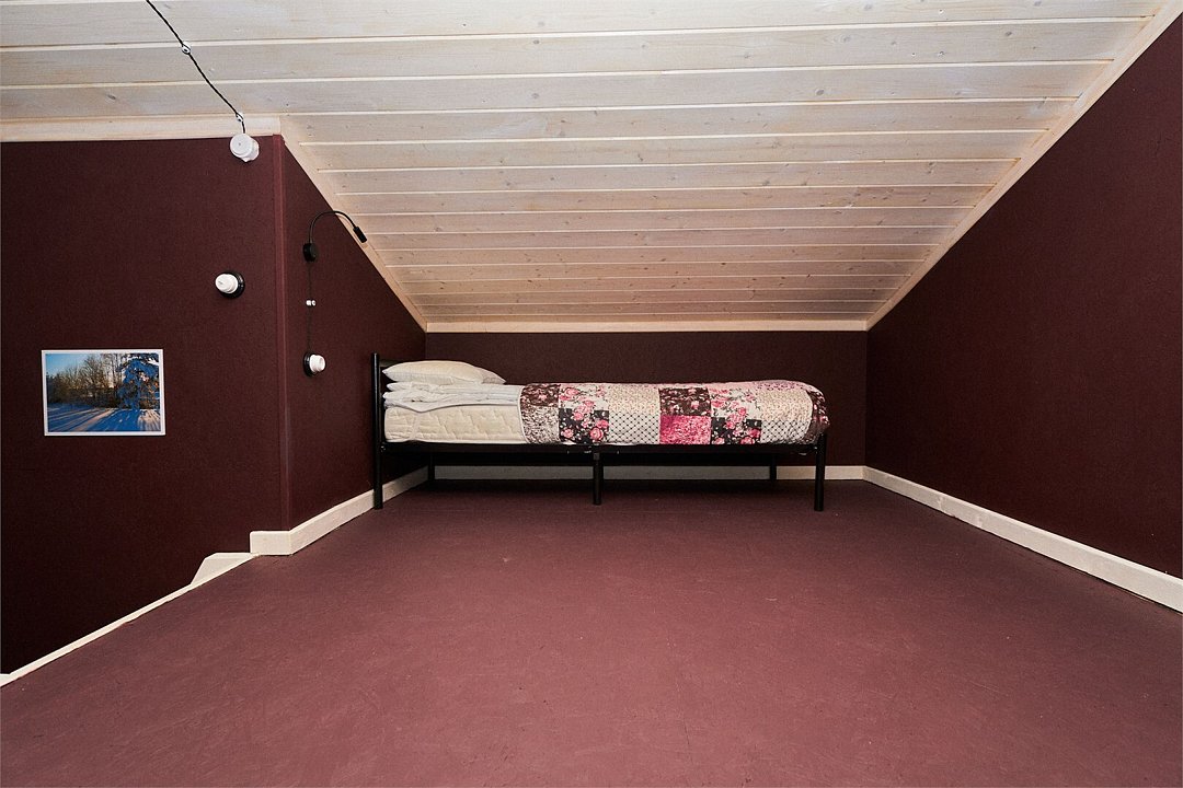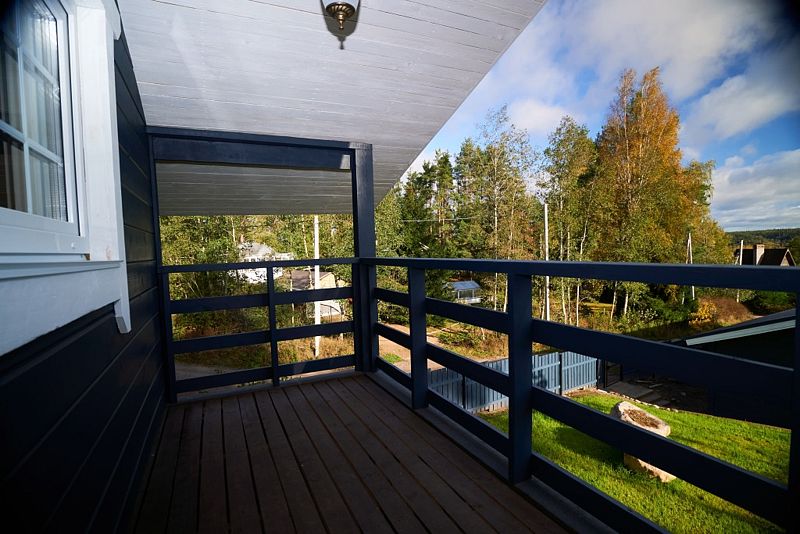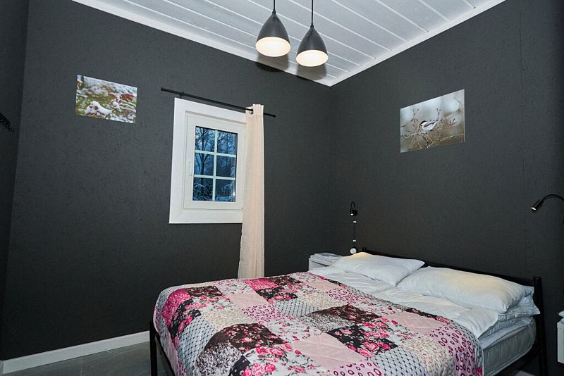 Коттедж с оригинальной конфигурацией: помимо спальни есть целых три кровати на втором ярусе (антресоли). При этом всё пространство открыто, что сохраняет ощущение простора. Есть терраса с мангалом.