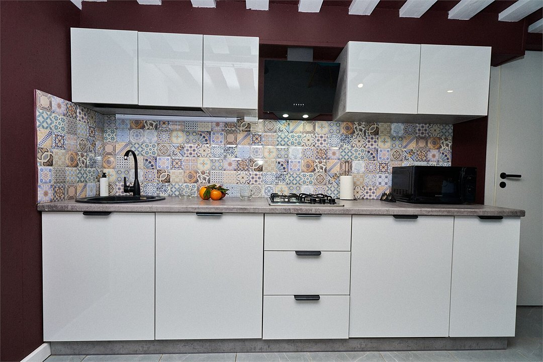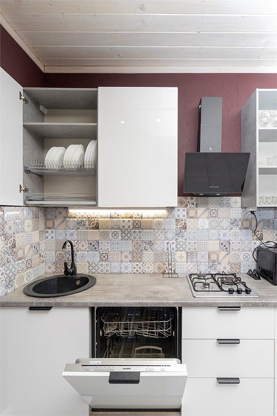 - техника: холодильник, газовая плита, микроволновка, посудомойка, телевизор;
