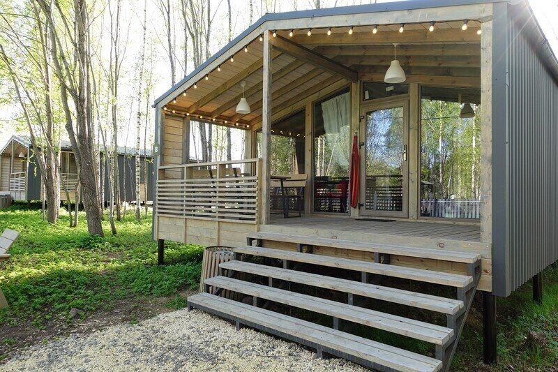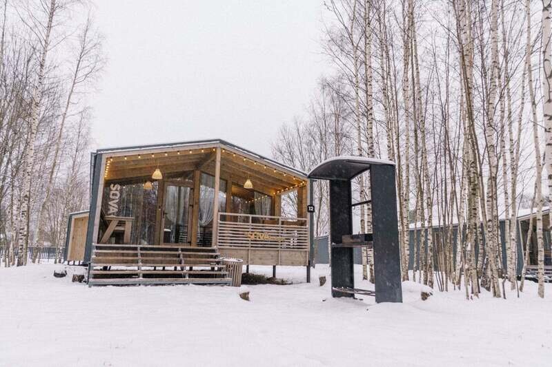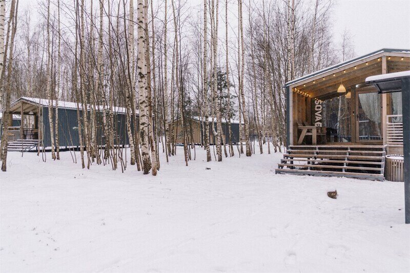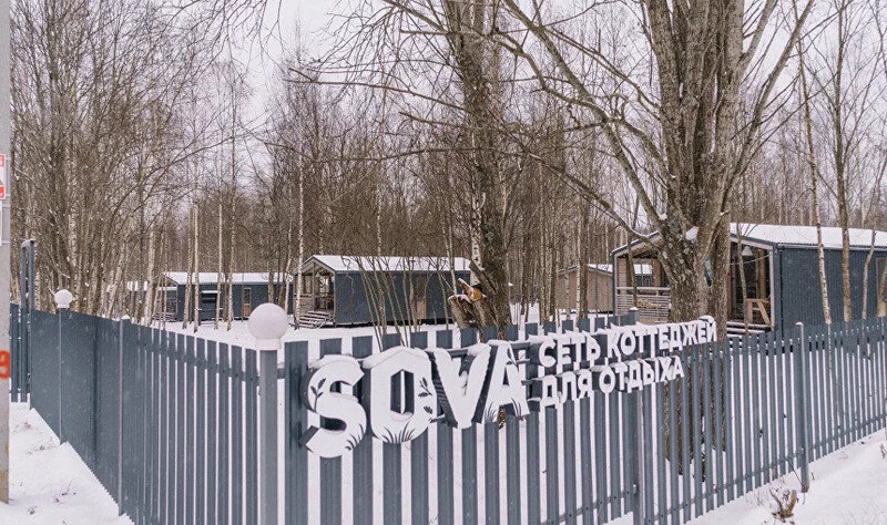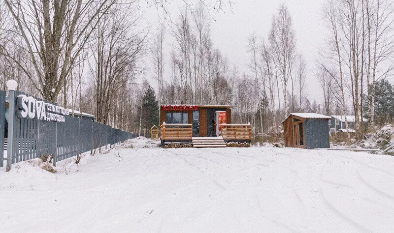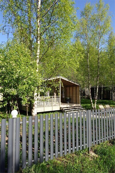 Территория локации имеет общее ограждение вокруг 13ти коттеджей, с панорамными окнами на террасе, с видом на частный сектор.