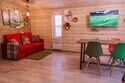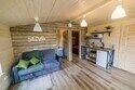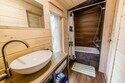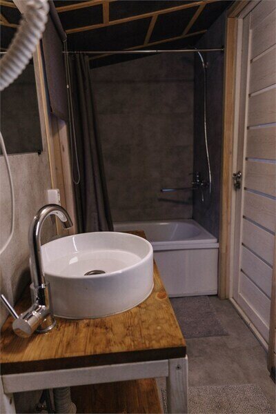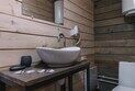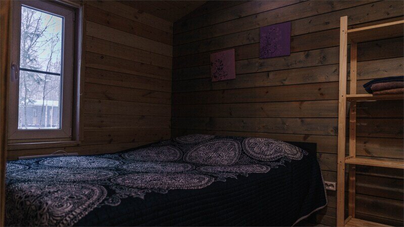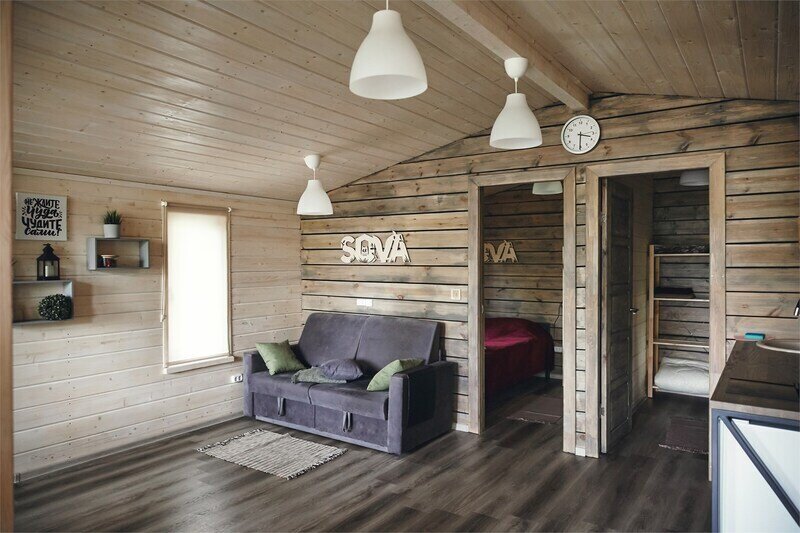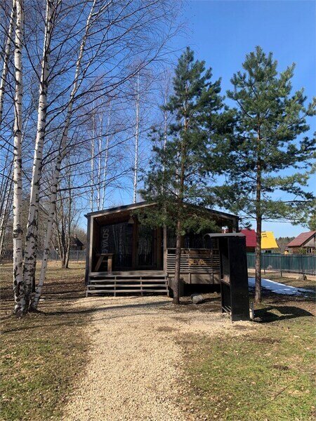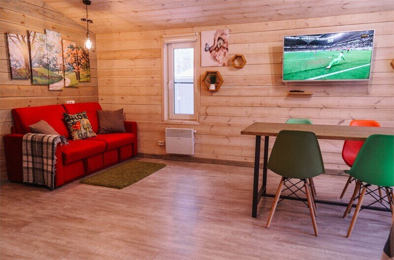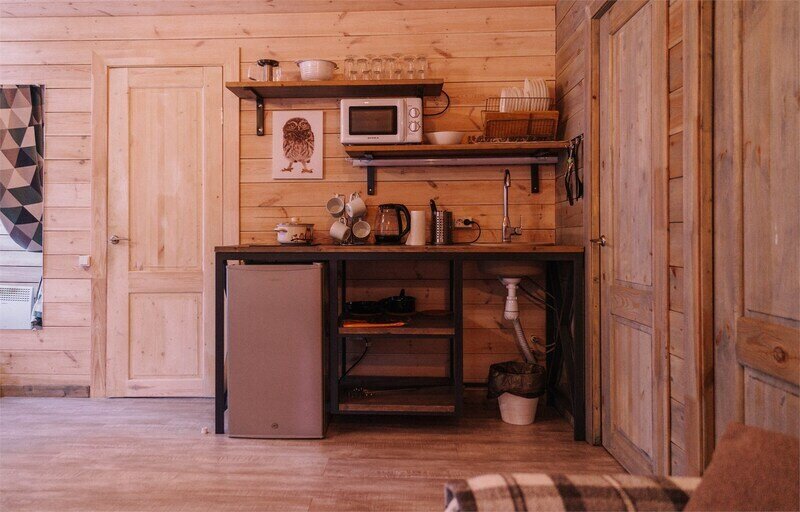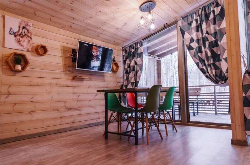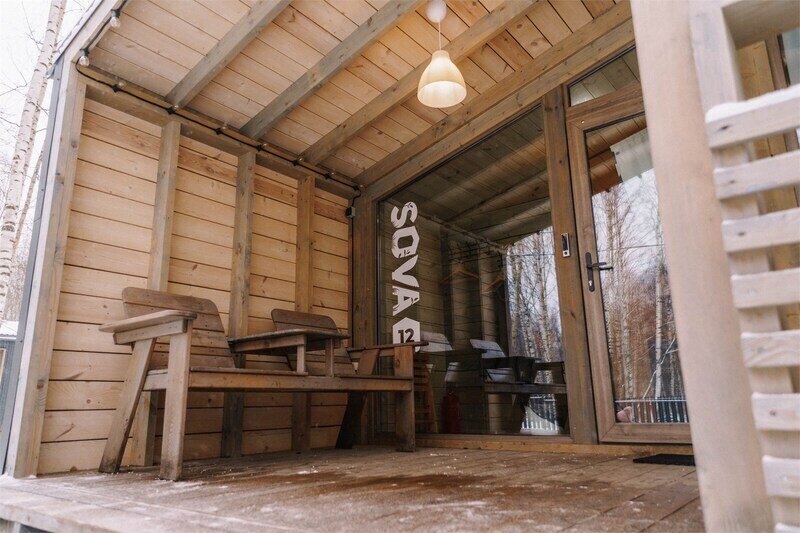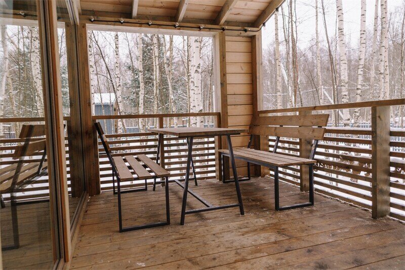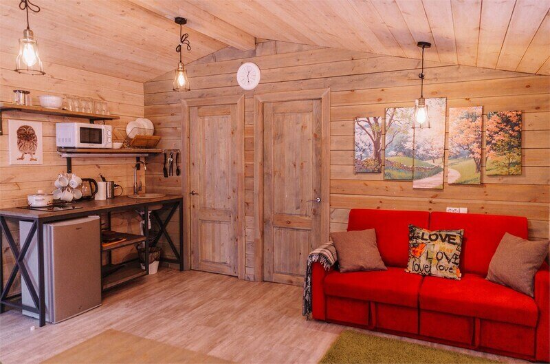 В банном доме есть кухонная зона с кулером, микроволновой печью, чайником и посудой, гостиная зона с панорамными окнами, столом, диваном и телевизором. Совмещенный санузел. Крытая терраса с уличной мебелью.