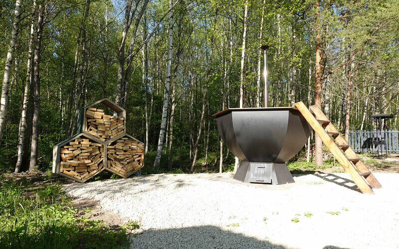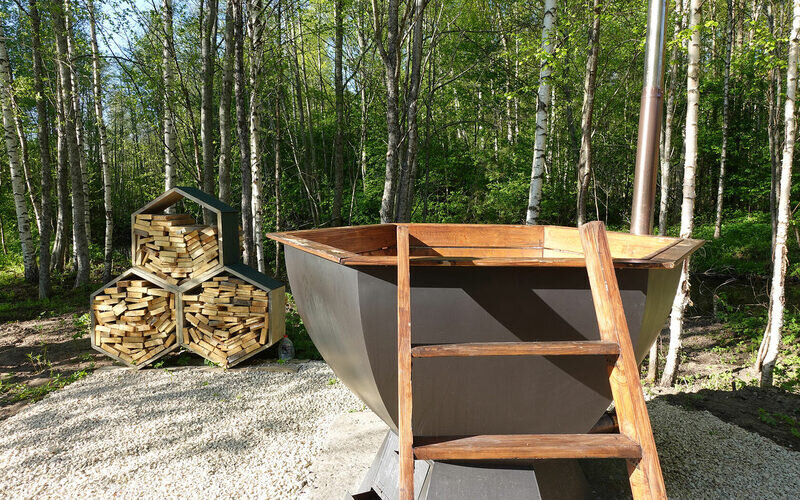 Горячие ванны на открытом воздухе. Печь дает возможность нагреть воду до нужной температуры, благодаря чему купание в чане комфортно даже в зимнее время года.