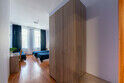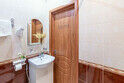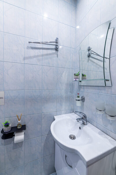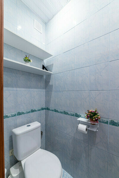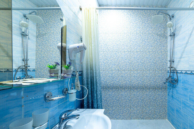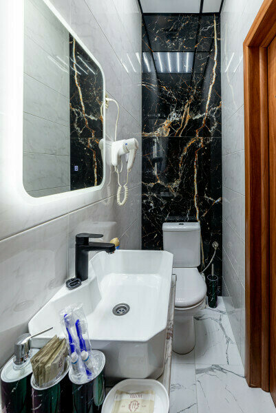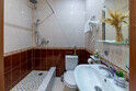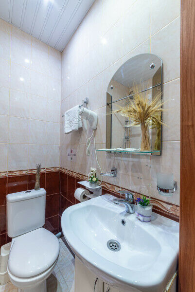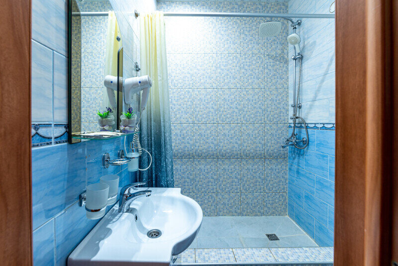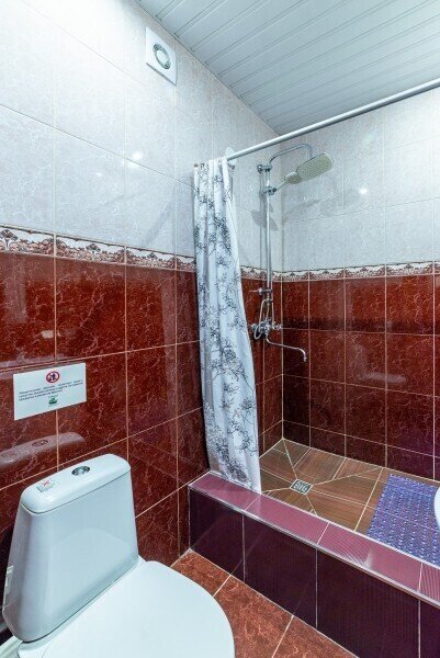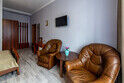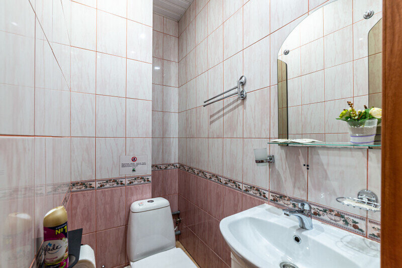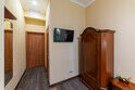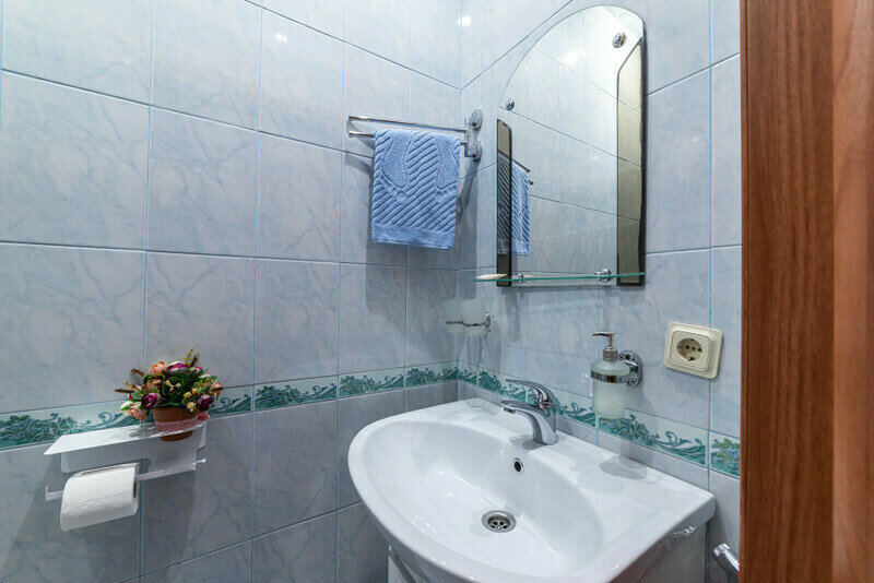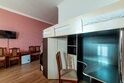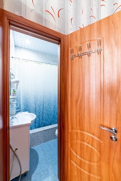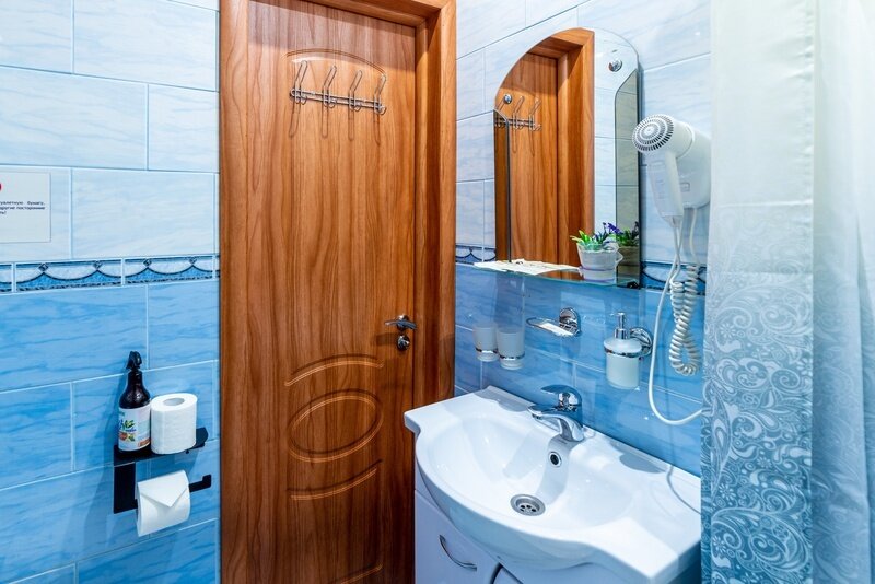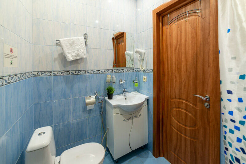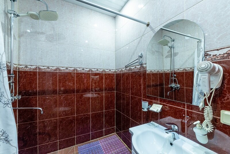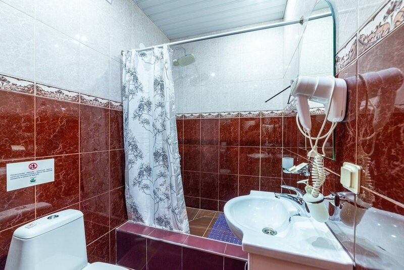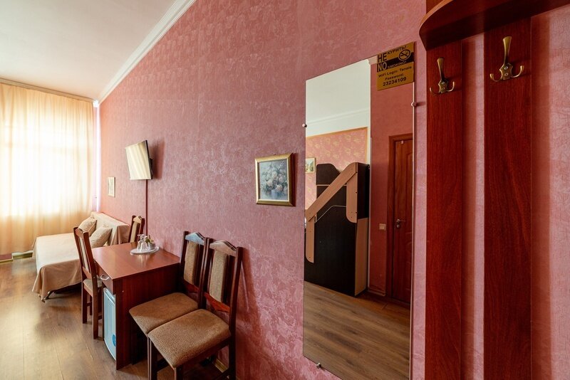 Также есть большой холодильник, электрочайник, бесплатный чай и кофе. Зеркало во весь рост, вешалка и шкаф-купе. Стол со стульями. В ванной комнате: глубокая небольшая ванна, умывальник и унитаз, тапочки, полотенца, фен и туалетные принадлежности. Гостям предоставляются утюг и гладильная доска. Есть кондиционер.