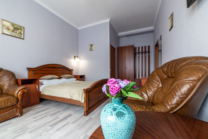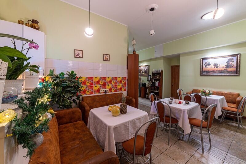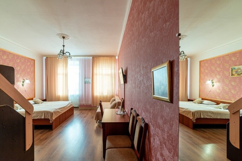Семейный отдыхДостоинстваОтель расположен на верхнем этаже жилого дома. Приехали уже вечером и сначала не заметили вывеску, но повезло с парковкой — нашли место напротив входа. Приятно отметить, что администратор быстро предоставила адрес гостиницы по телефону и отправила его в смс. В номере есть мини-кухня, и чай с кофе включены в стоимость размещения. Также есть возможность заказать завтрак в общей кухне, что оказалось очень удобным для нас, путешествующих с двумя детьми.