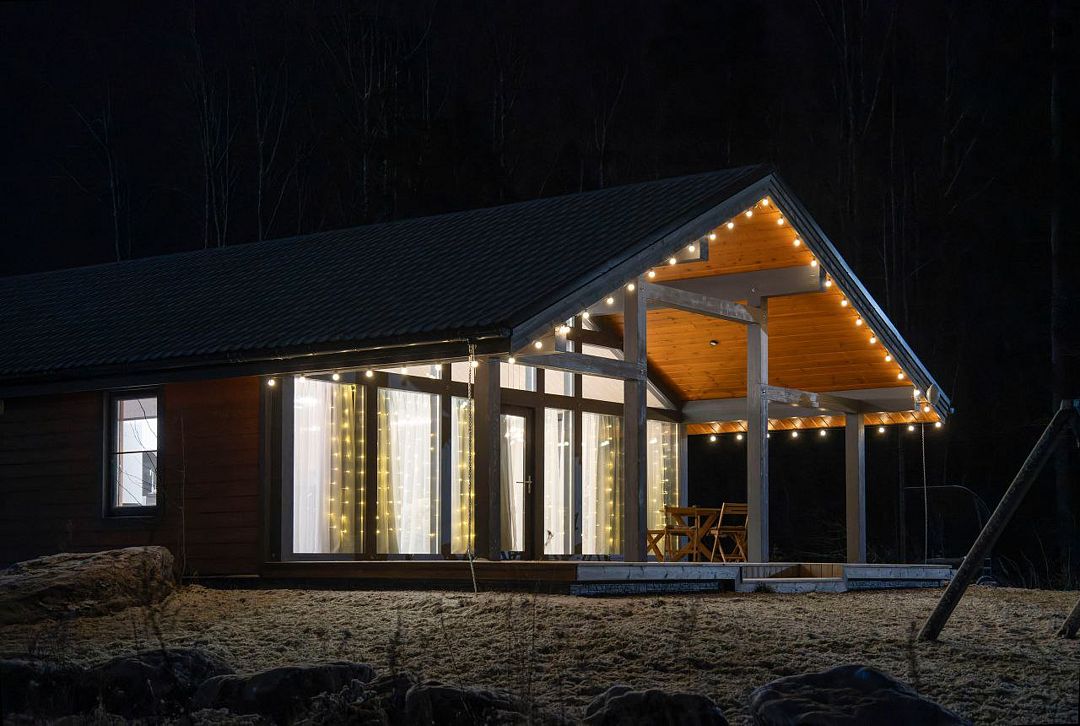 Коттедж расположен на территории новой строящейся базы отдыха «Тихая Гавань» в 10 км от Выборга. Выполнен в современном стиле, функциональный, светлый и просторный.