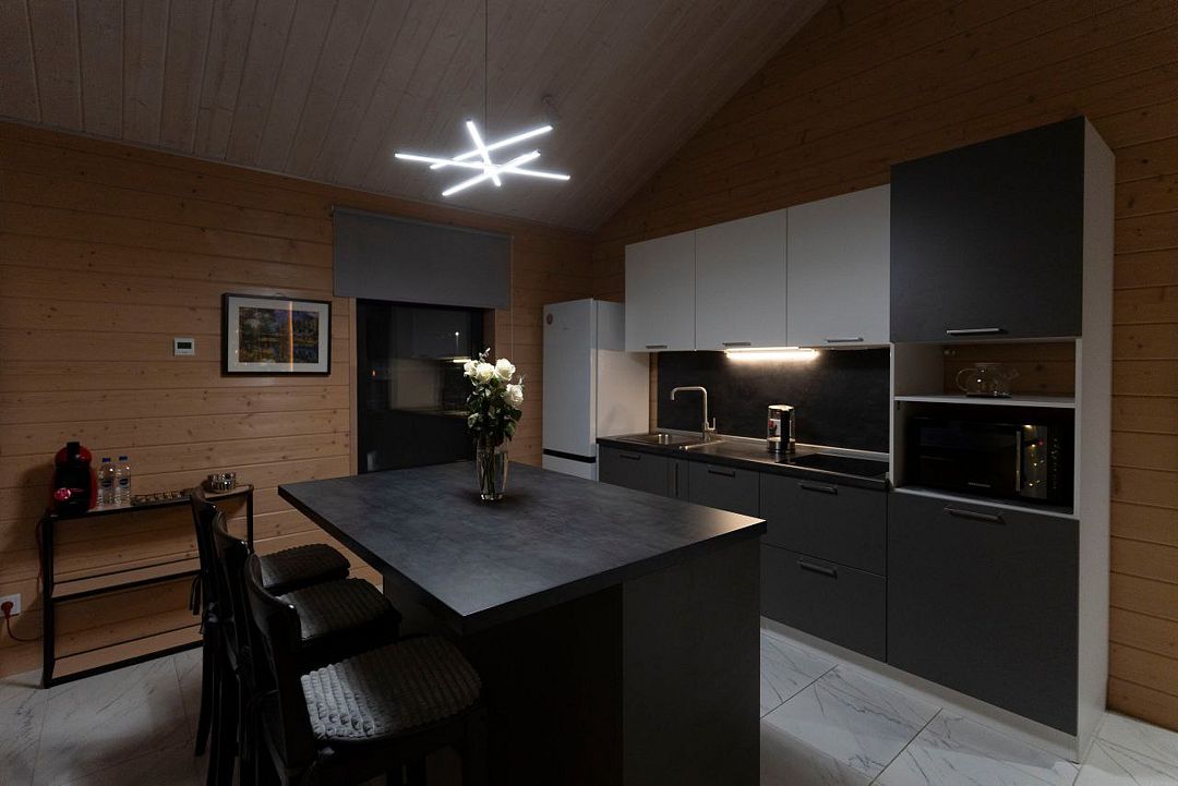 - просторная кухня с островом и всей необходимой бытовой техникой и кухонной утварью;