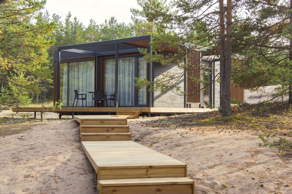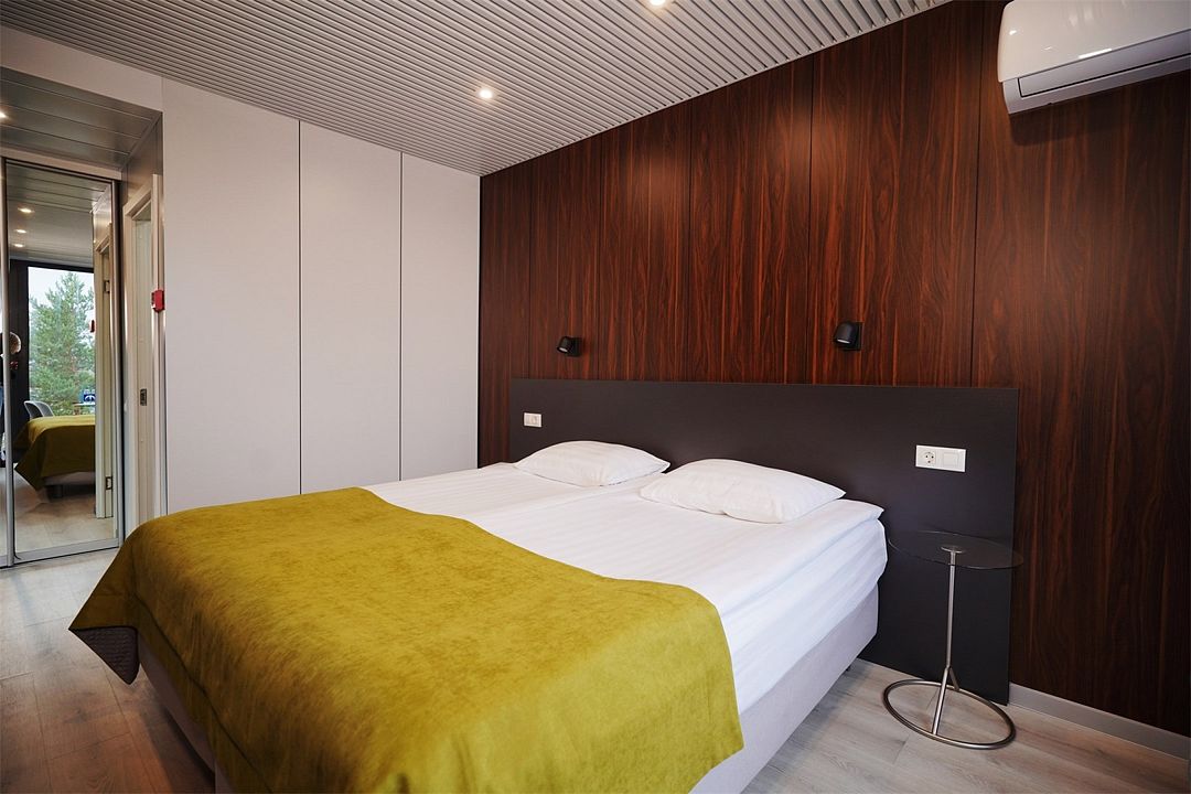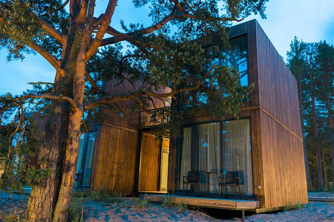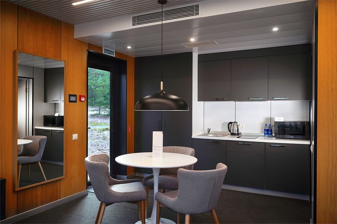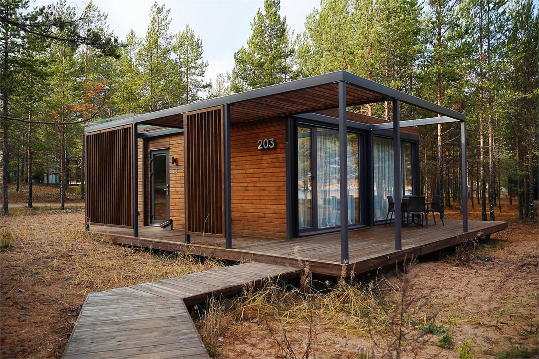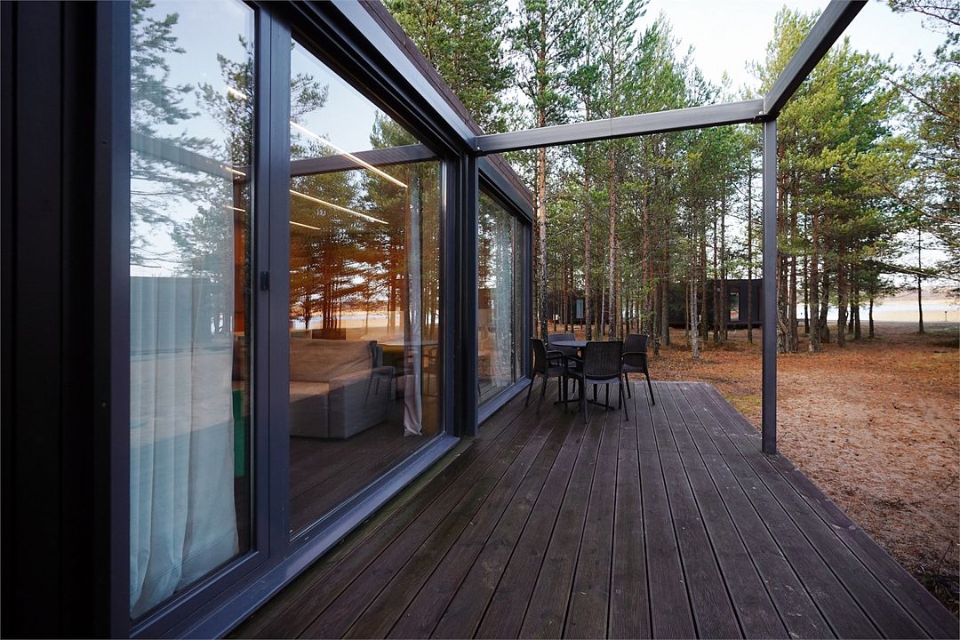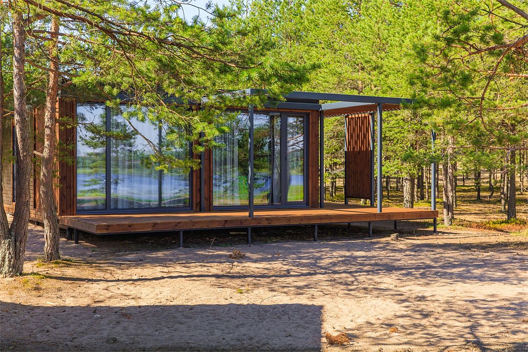 Все модули имеют отдельный вход и панорамные окна во всю стену, из которых открывается живописный вид на Ладожское озеро. Модуль полностью укомплектован всем необходимым: ванная комната с душевой кабиной, две отдельные кровати, легко превращающиеся в одну двуспальную, журнальный столик с креслами, телевизор, гардеробный шкаф.