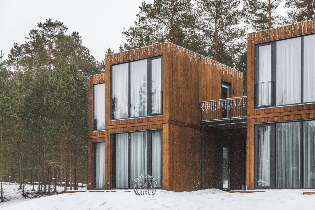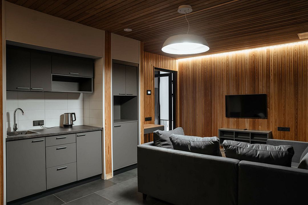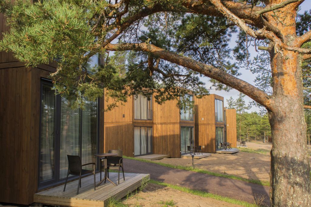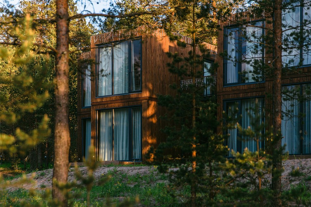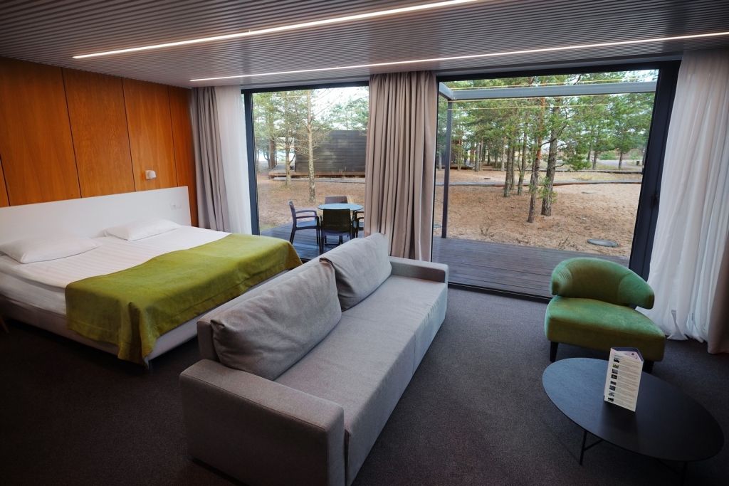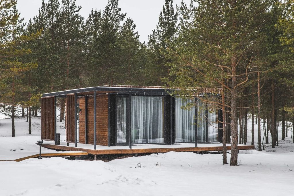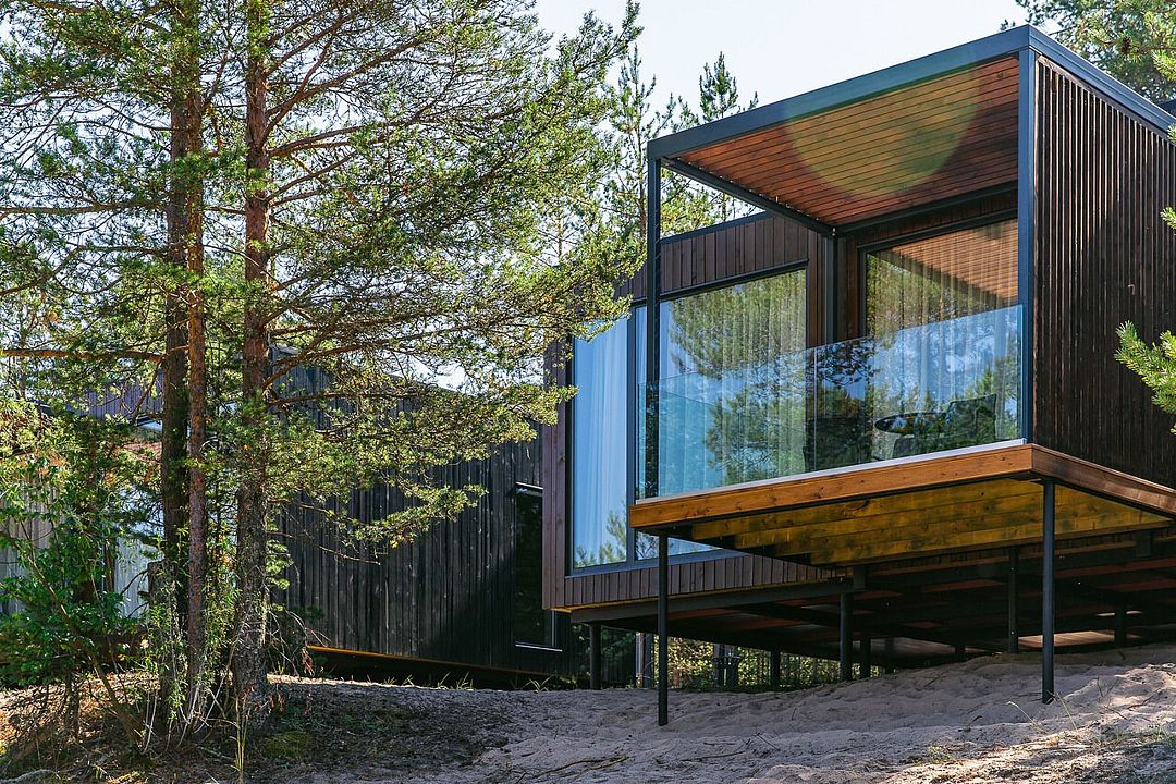 Все модули имеют отдельный вход и панорамные окна во всю стену, из которых открывается живописный вид на Ладожское озеро. Модуль полностью укомплектован всем необходимым: ванная комната с душевой кабиной, две отдельные кровати, легко превращающиеся в одну двуспальную, журнальный столик с креслами, телевизор, гардеробный шкаф.