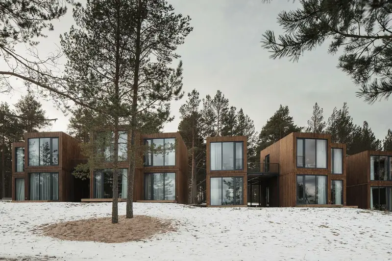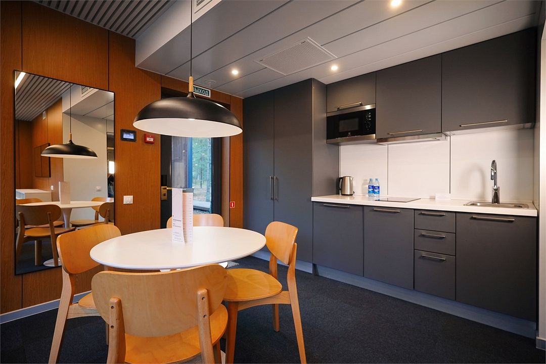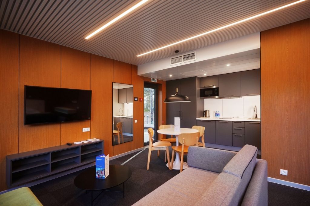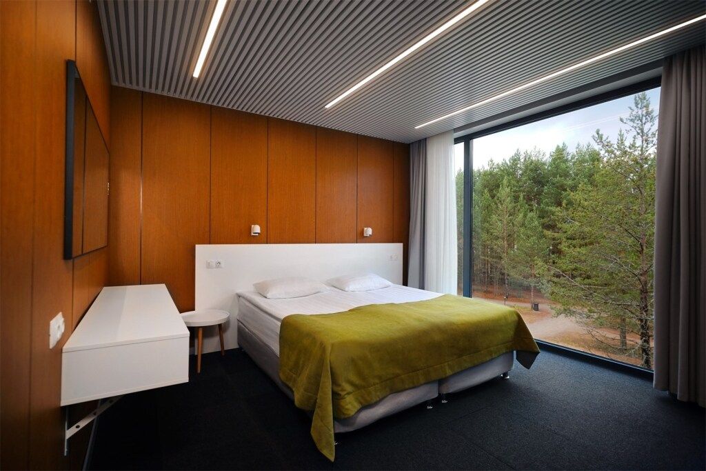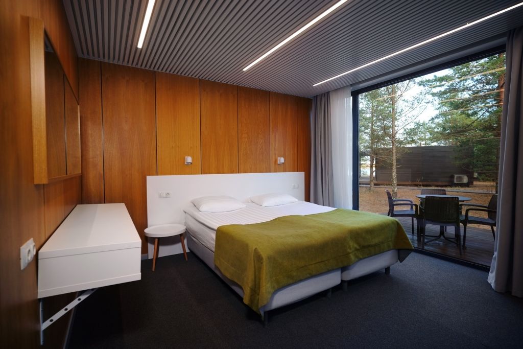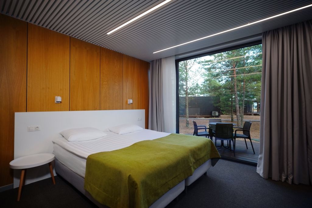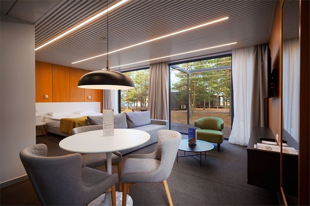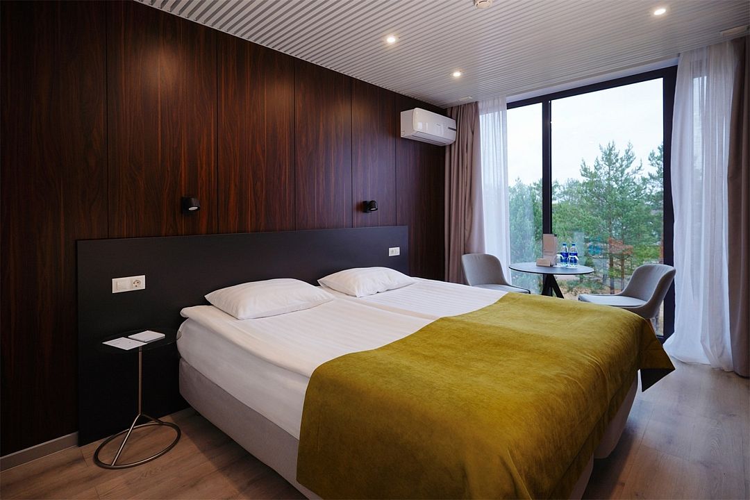 Все модули имеют отдельный вход и панорамные окна во всю стену, из которых открывается живописный вид на Ладожское озеро. Модуль полностью укомплектован всем необходимым: ванная комната с душевой кабиной, две отдельные кровати, легко превращающиеся в одну двуспальную, журнальный столик с креслами, телевизор, гардеробный шкаф.