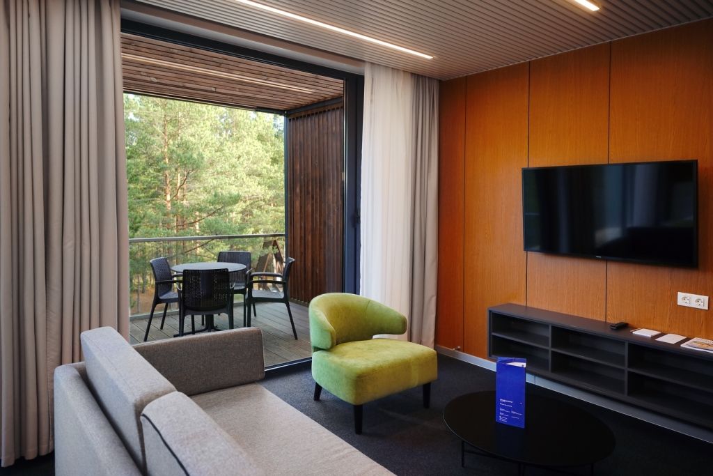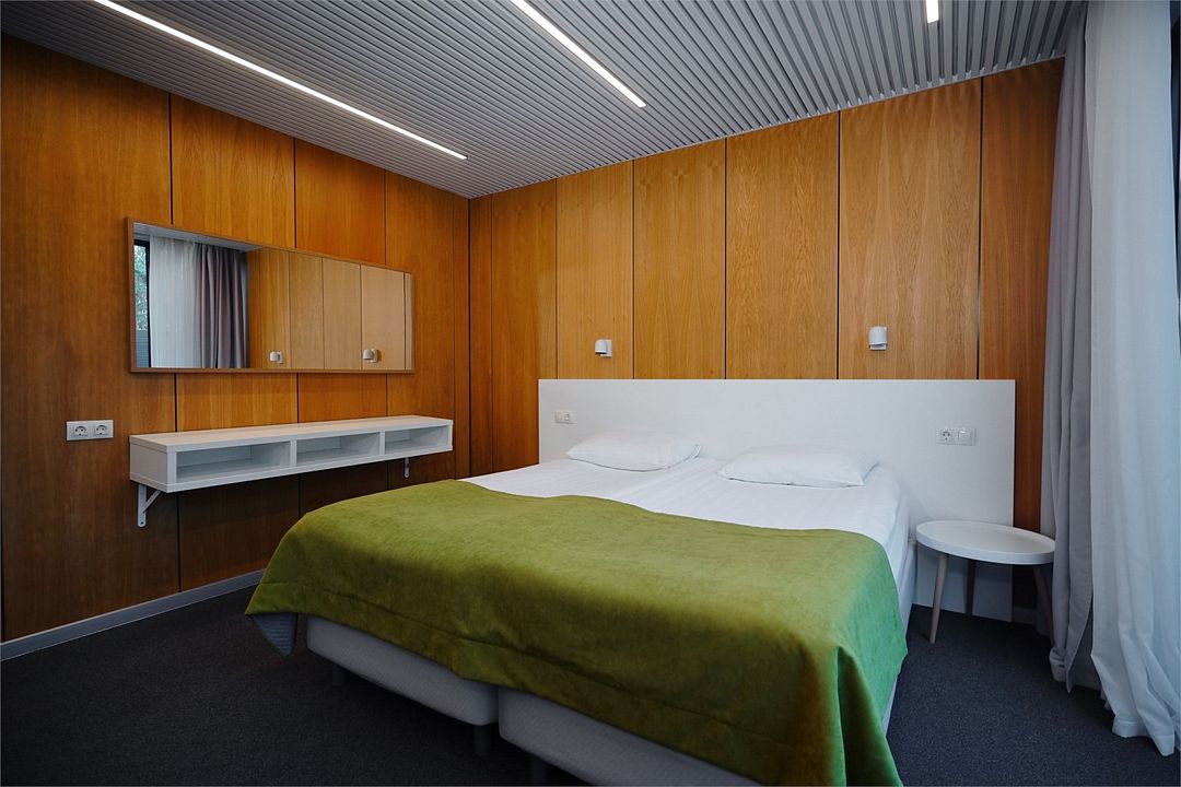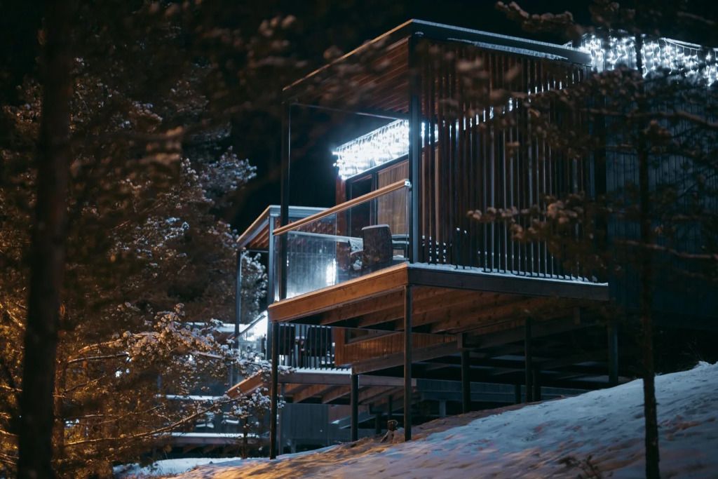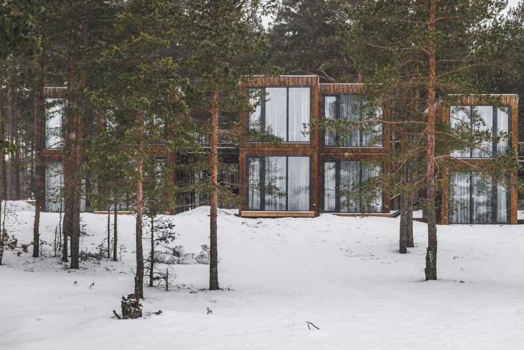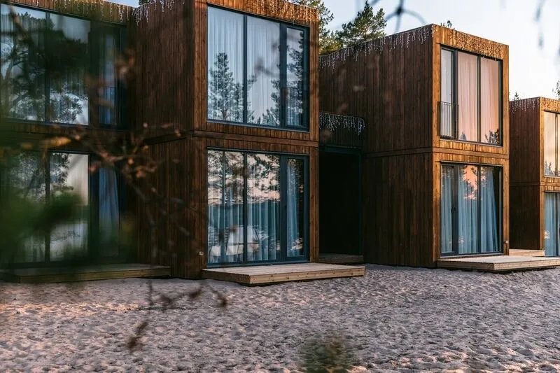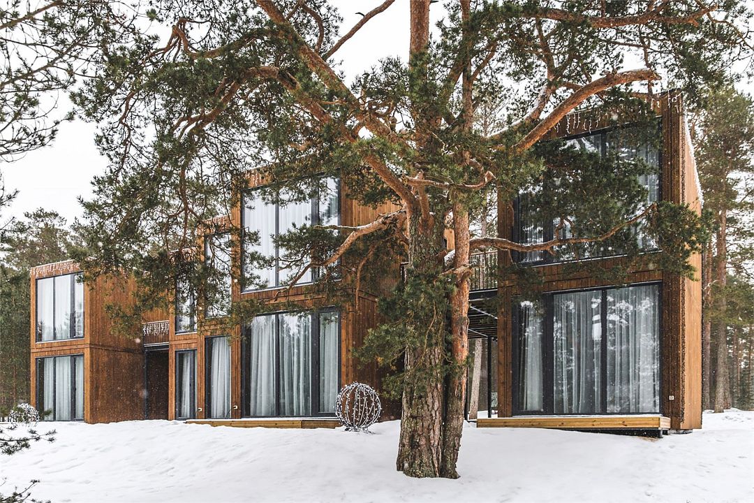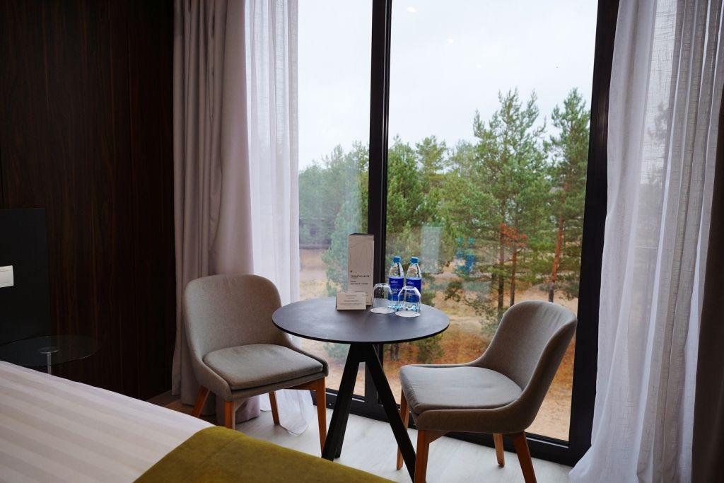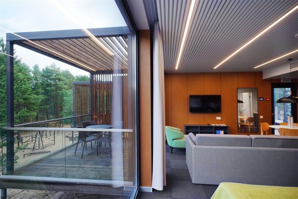 Все модули имеют отдельный вход и панорамные окна во всю стену, из которых открывается живописный вид на Ладожское озеро. Модуль полностью укомплектован всем необходимым: ванная комната с душевой кабиной, две отдельные кровати, легко превращающиеся в одну двуспальную, журнальный столик с креслами, телевизор, гардеробный шкаф.