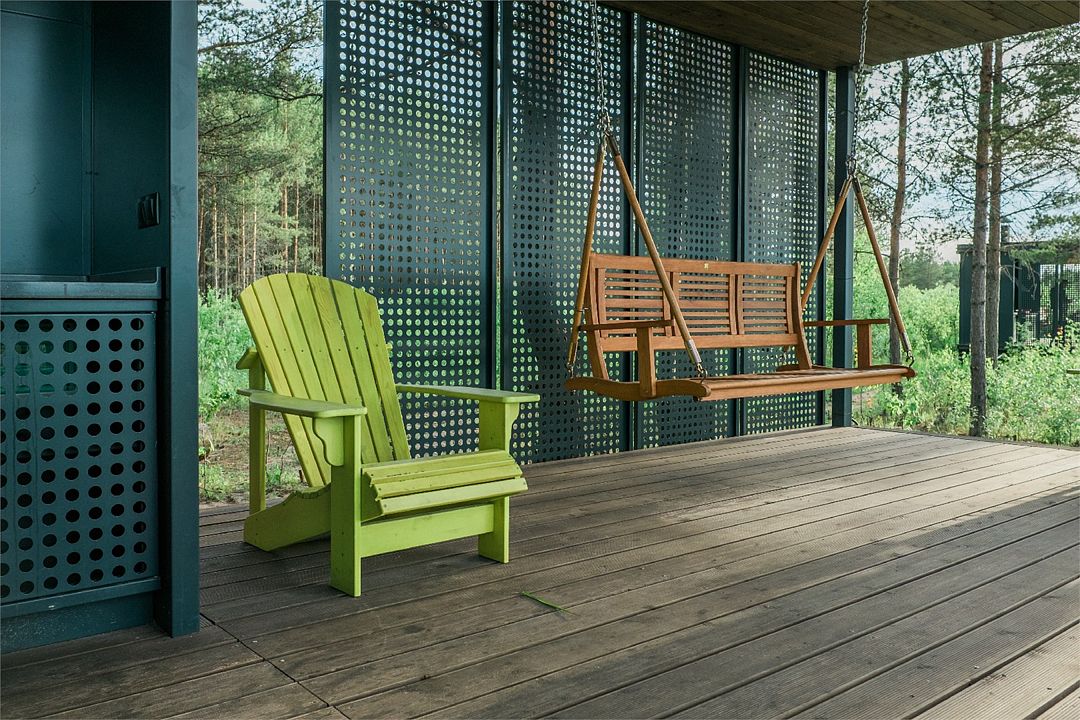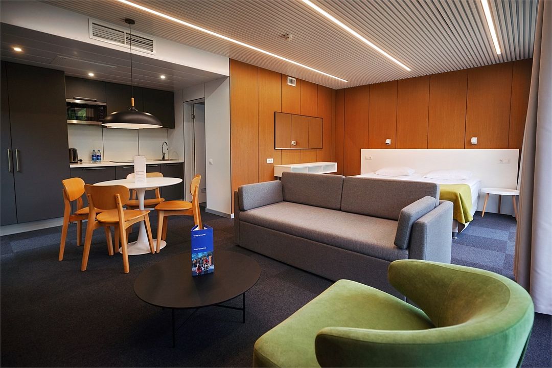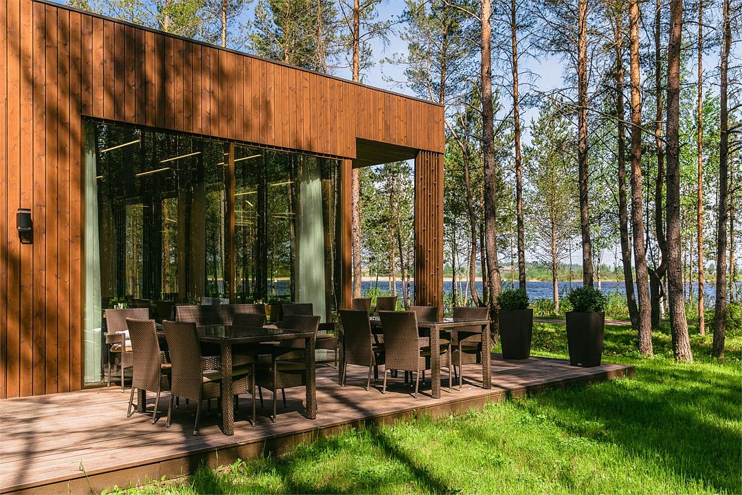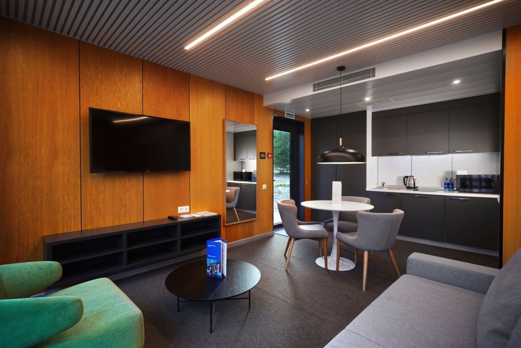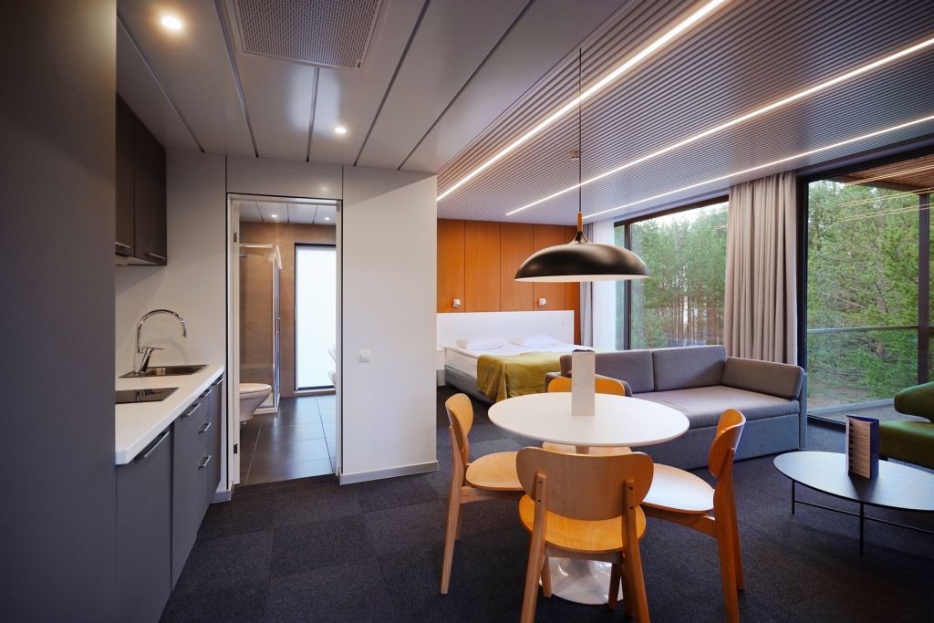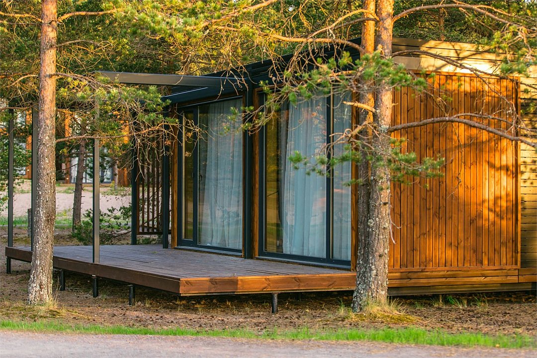 Номер Семейный Студия – это модуль площадью 36 кв.м., расположенный среди сосен вблизи береговой линии Вуоксы. Благодаря удобному зонированию пространства, в доме есть спальня и гостиная-студия с полностью оборудованной встроенной кухней, обеденным столом и зоной отдыха с телевизором. Индивидуальная терраса с мебелью расположена при выходе из комнаты. Номер рассчитан на 2 гостей с возможностью предоставления двух дополнительных мест для гостей до 13 лет (раскладной диван /стенка кровать).
