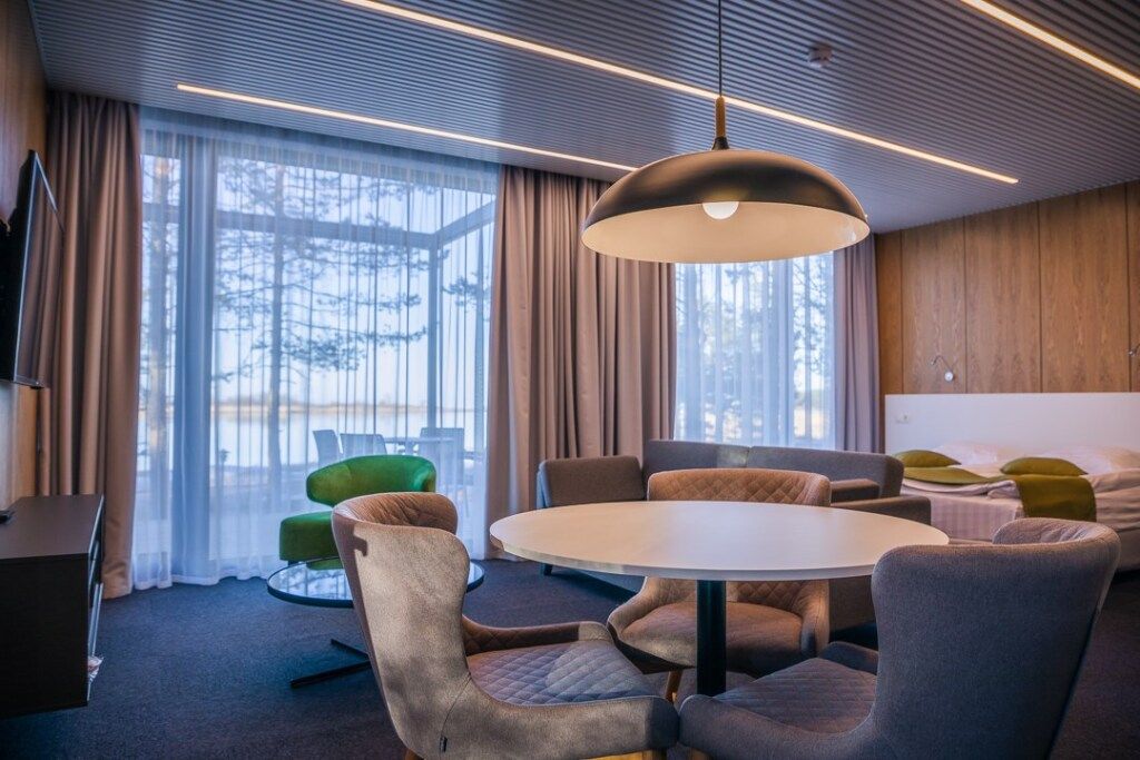 Номер Студия – это отдельный модуль площадью 34 кв. м., расположенный вдоль береговой линии Вуоксы. Благодаря удобному зонированию пространства, в доме есть спальня и гостиная-студия с полностью оборудованной встроенной кухней, обеденным столом и зоной отдыха с телевизором. Номер рассчитан на 2 гостей с возможностью предоставления дополнительного места для гостей до 13 лет (диван).