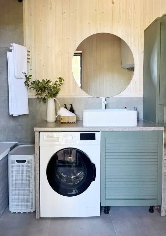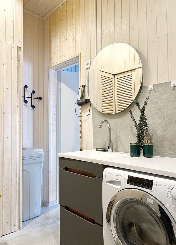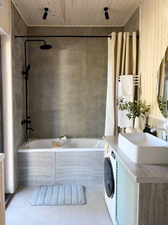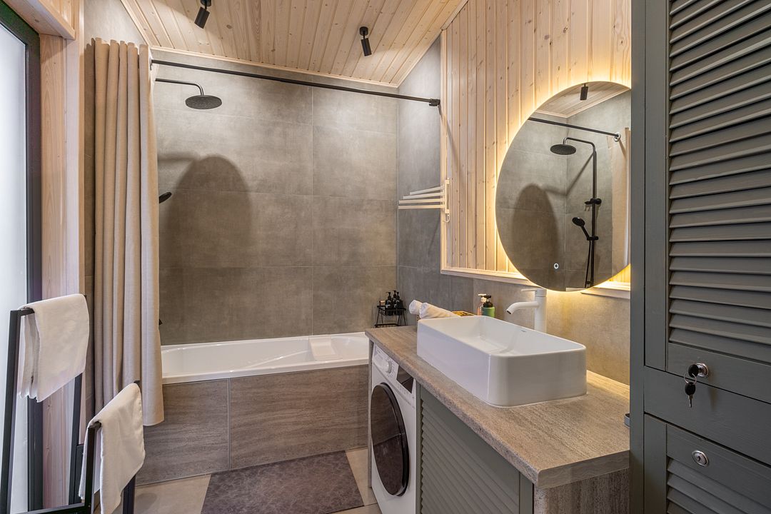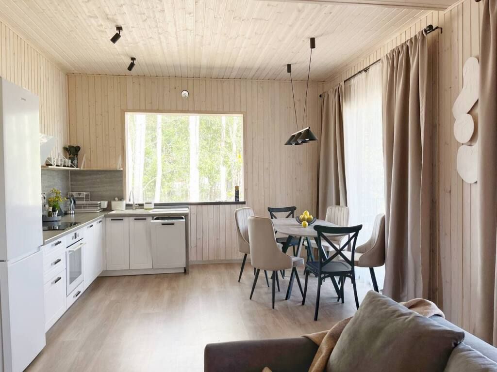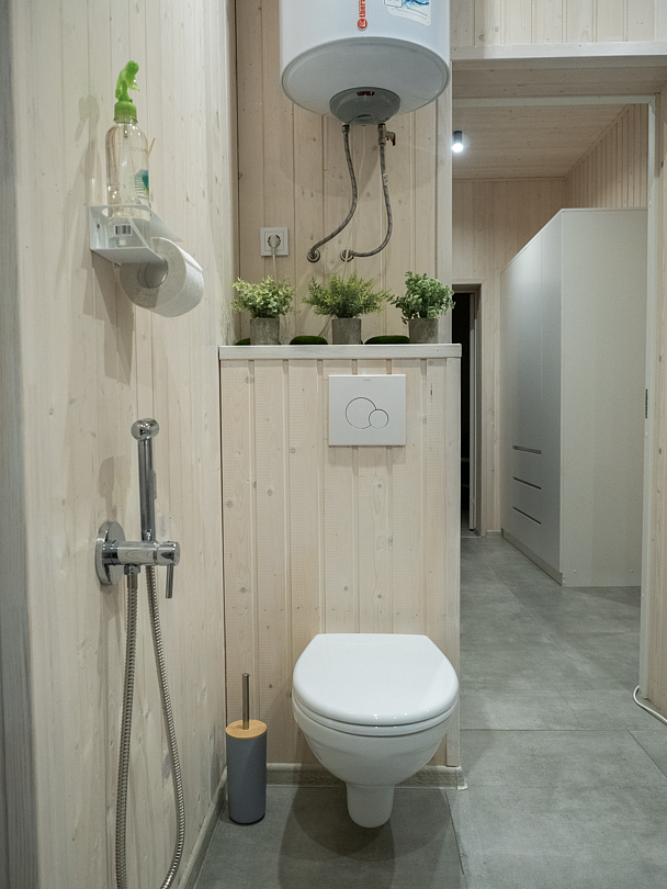 Внутри домика создана атмосфера уюта и комфорта. Просторная кухня-гостиная вмещает большую семью из четырех и более человек. Кухня оборудована всем необходимым для приготовления пищи: плитой, духовкой, холодильником и набором посуды. Две отдельные спальни обеспечивают полноценный отдых всем членам семьи. Дополнительные удобства включают кондиционер, теплые полы, стиральную машину, капсульную кофемашину, посудомоечную машину и детскую мебель, что делает пребывание максимально комфортным для всех возрастов.