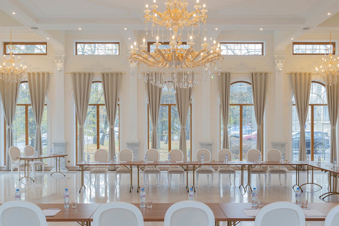 Легкий и прозрачный, с панорамными окнами и высоким потолком, сочетает в себе атмосферу дворцовой оранжереи и динамичность современного многофункционального пространства. Не случайно выбран белый цвет в оформлении интерьера зала, он позволяет легко трансформировать существующее пространство под любые мероприятия.