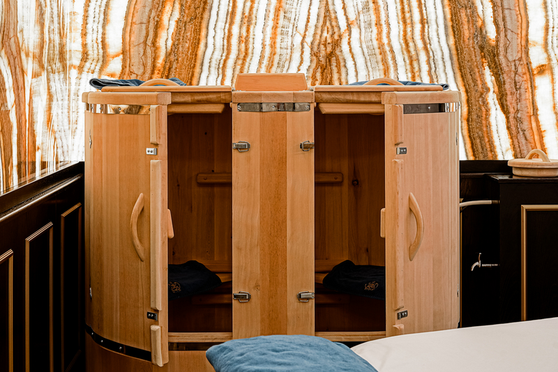 Гардеробные комнаты оснащены душевыми и туалетными комнатами, индивидуальными шкафчиками, укомплектованными халатами. Также для удобства гостей предусмотрены полотенца и тапочки для посещения влажных зон.