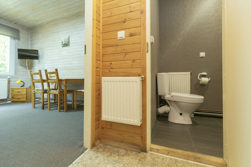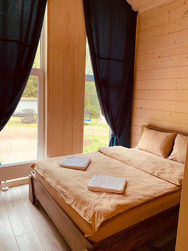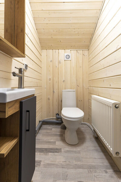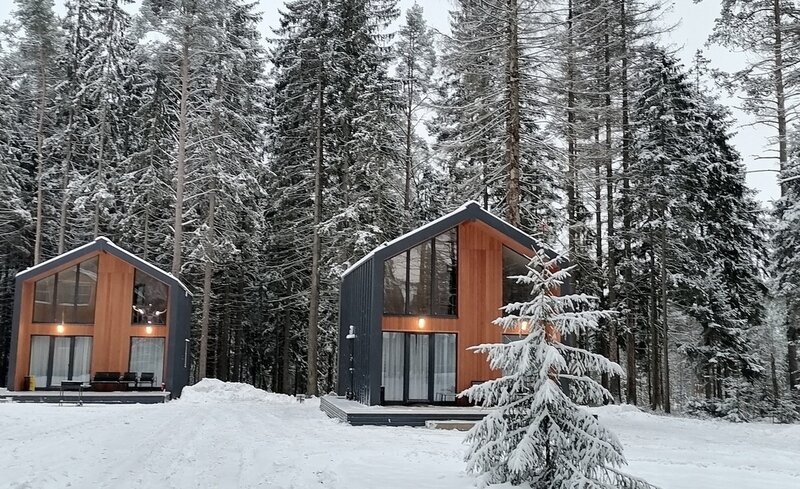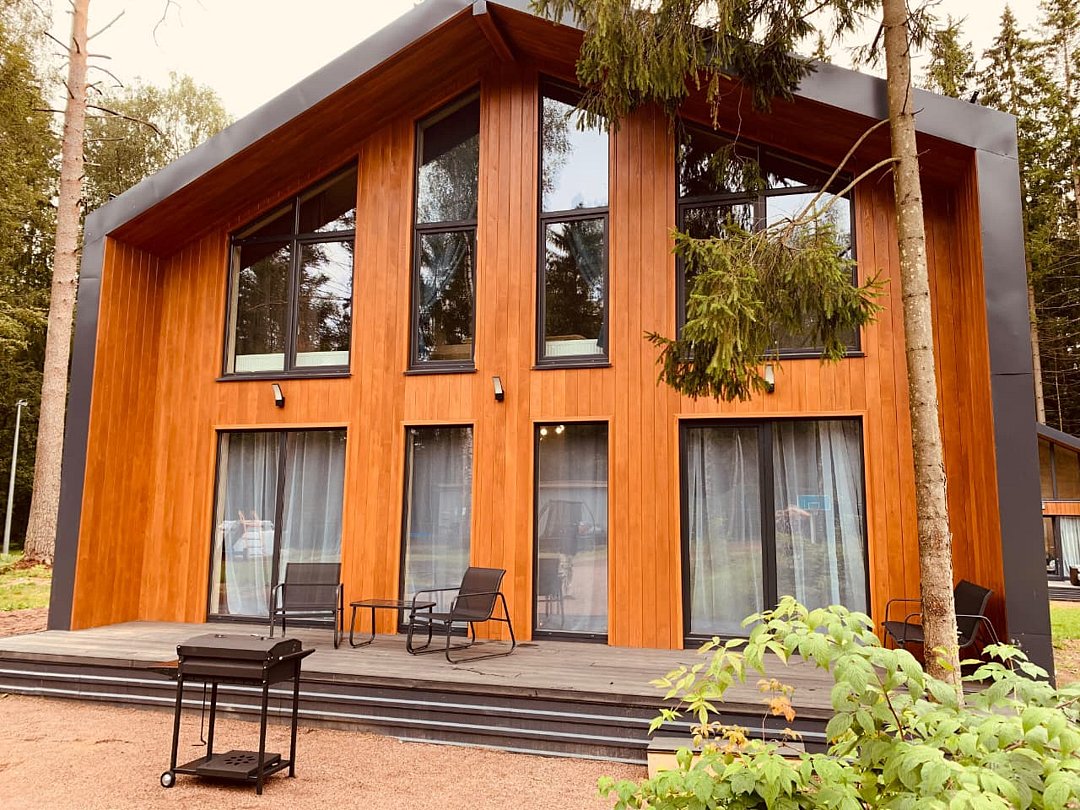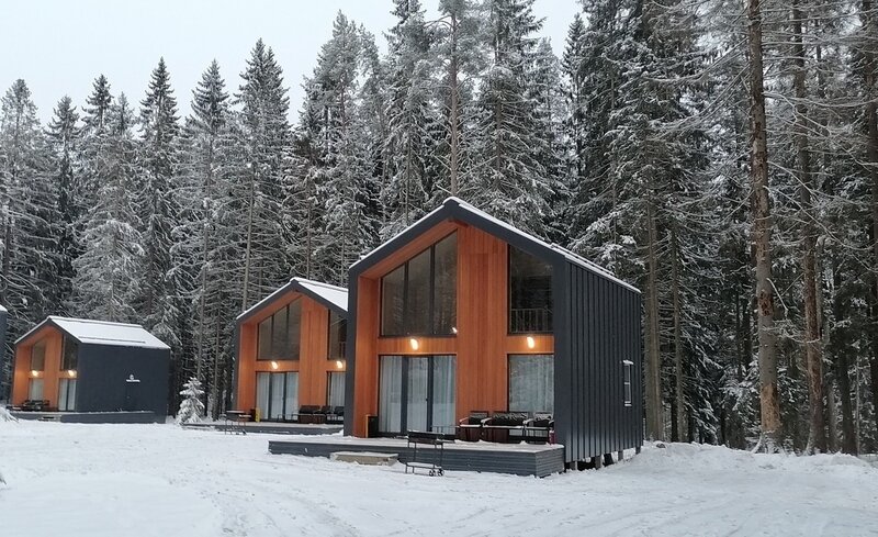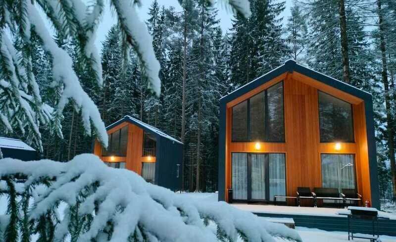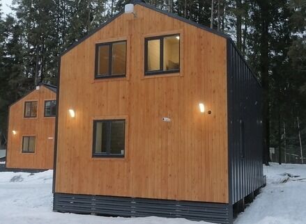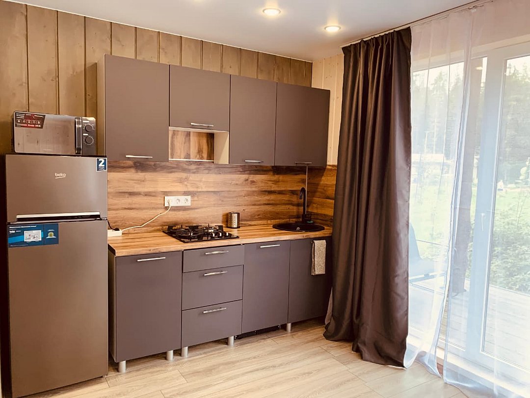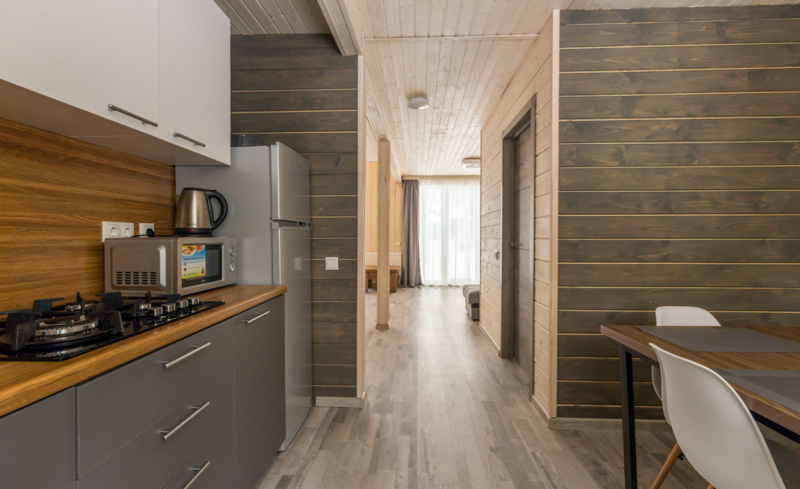 В домиках установлены новые кухни с индукционной плиткой и набором необходимой посуды, холодильник, стол со стульями, жк телевизор с цифровыми каналами. Санузел с унитазом, раковиной и душевой кабиной. В санузле установлены теплые полы. Имеется небольшой коридор(прихожая) и помещение для спортивного инвентаря. Отопление централизованное.