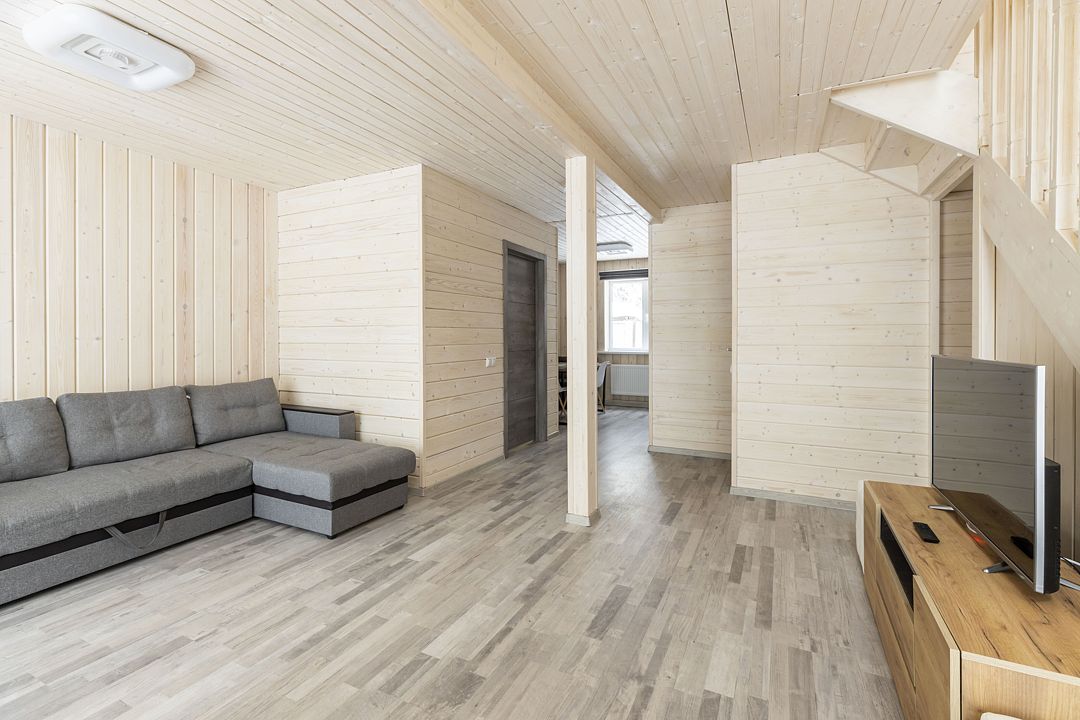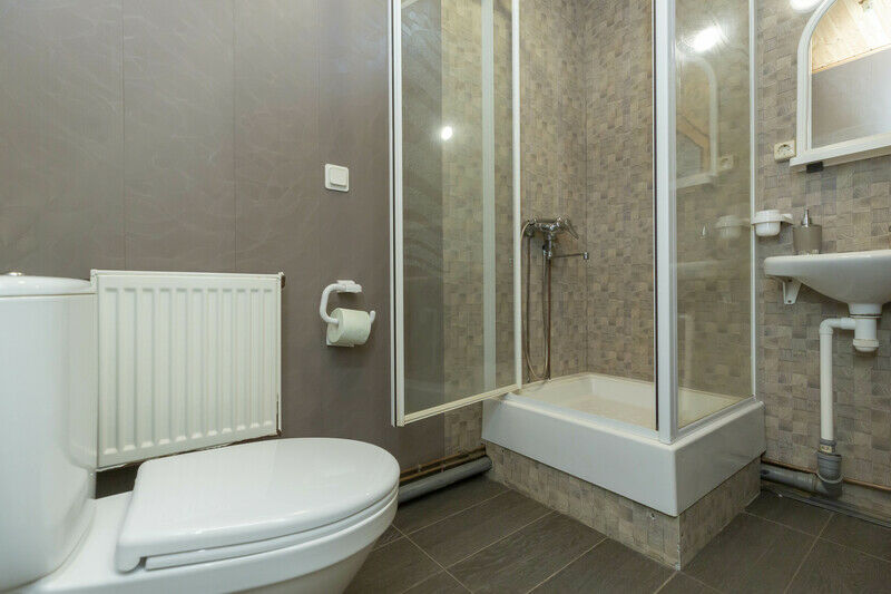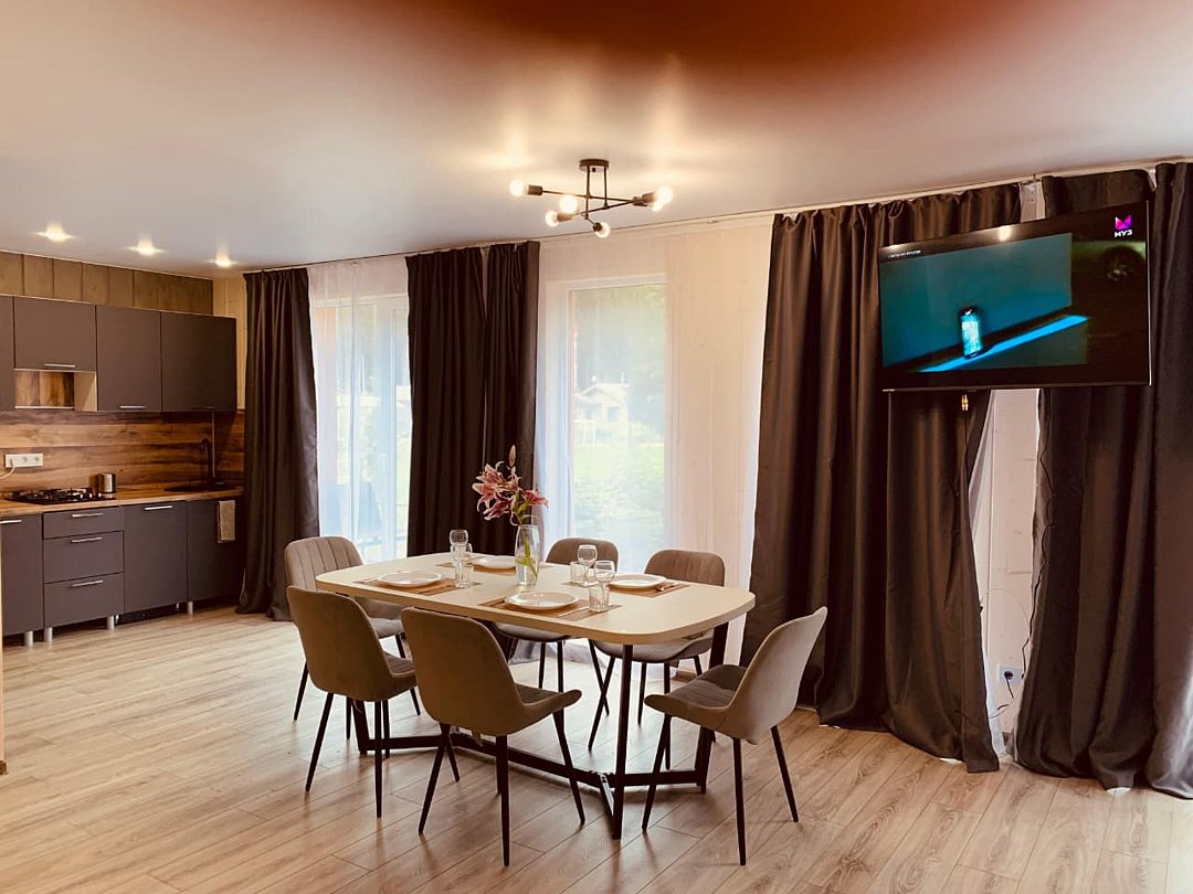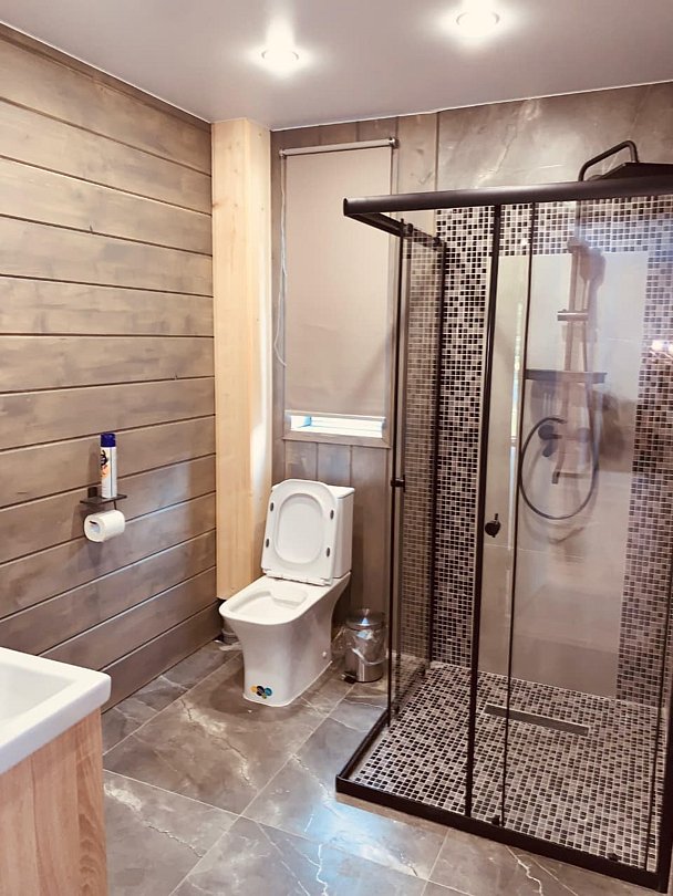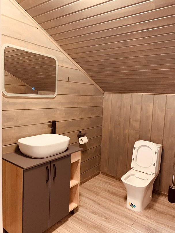 2 санузла, основной на первом этаже с душевой и дополнительный на 2-ом этаже. Большая гостиная совмещенная с кухней позволяет комфортно располагаться большой компании. Дом оборудован всем необходимым как для краткосрочной аренды, так и длительной.