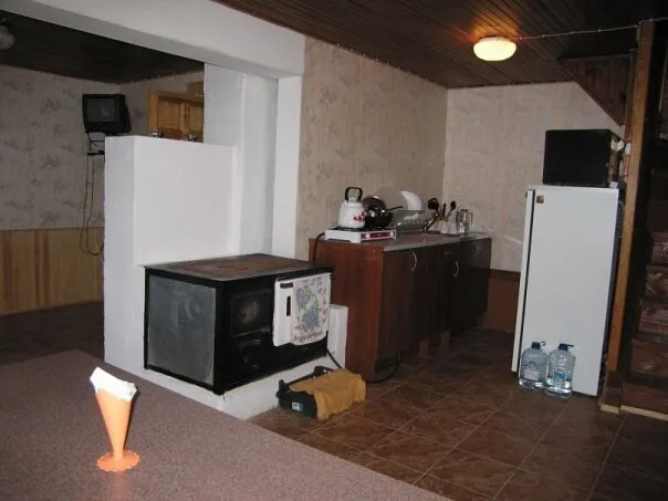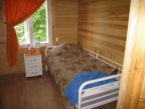 Деревянный коттедж на 5 человек. Внутренняя отделка – светлое дерево. 1 этаж просторная оборудованная кухня-гостиная (2 зала) с дровяной печью, газовой плитой, СВЧ, холодильником, имеется полный комплект необходимой посуды, ТВ. 2 этаж 3 спальни (кровати раздельные, тумбочки). Доп. место: 2-спальный диван в гостиной.