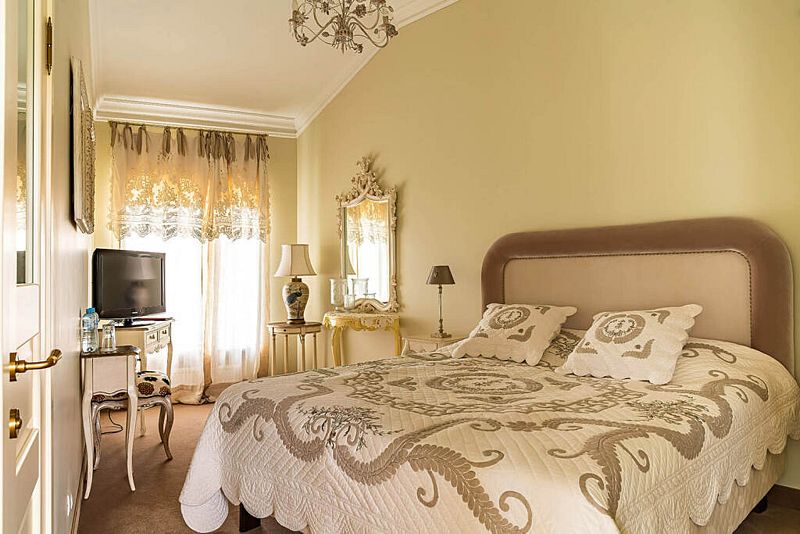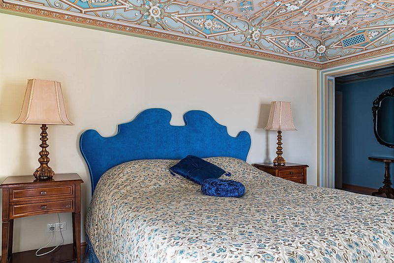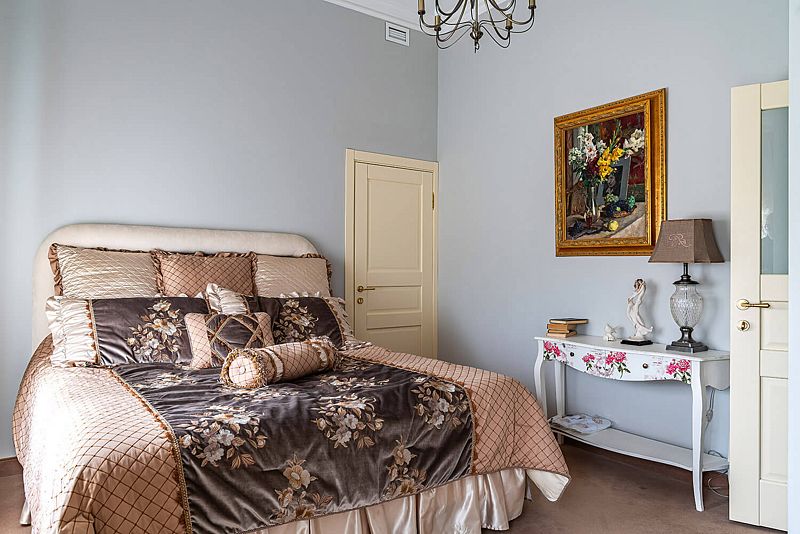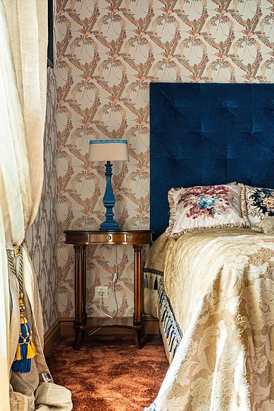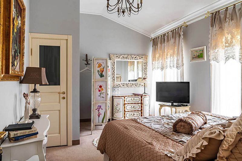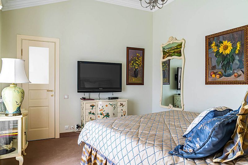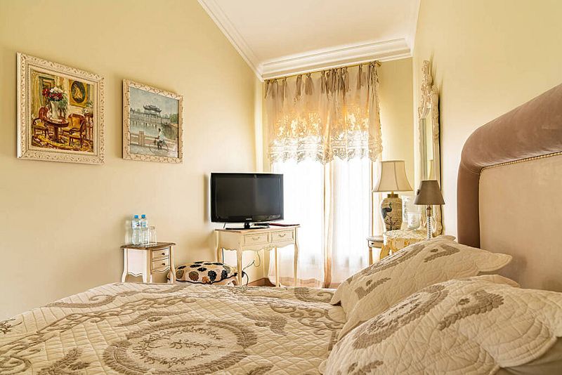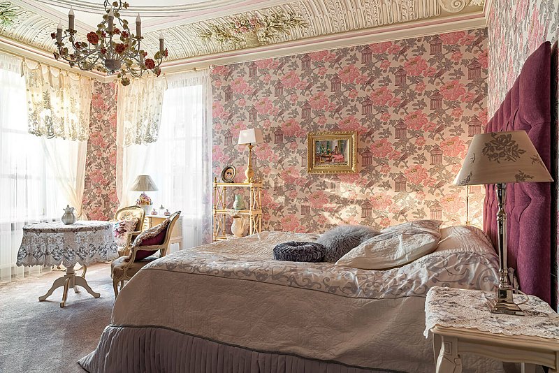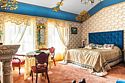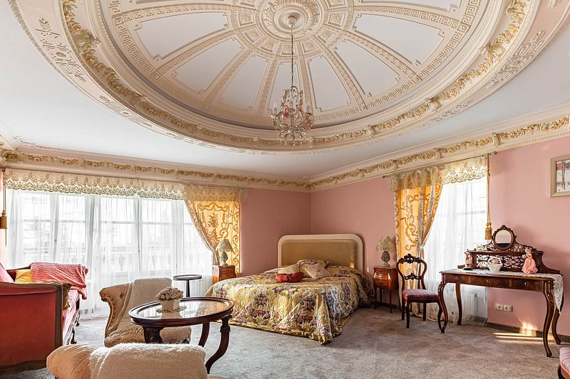 Небольшая по размеру, но очень изящная, гармоничная гостевая комната для двоих. Светлые тона в декоре, картины, резная мебель, но главная и притягивающая к себе внимание деталь — это лепной узорчатый потолок, собравший в себя все цвета комнаты.