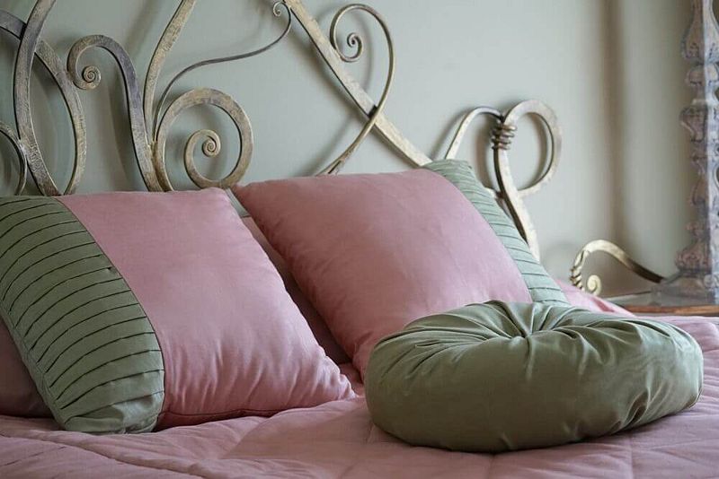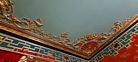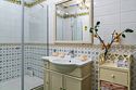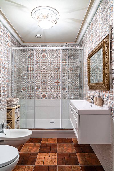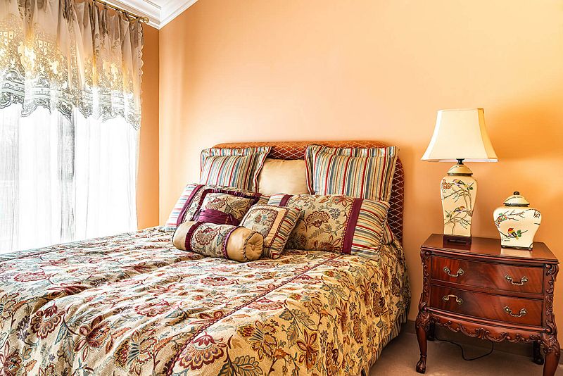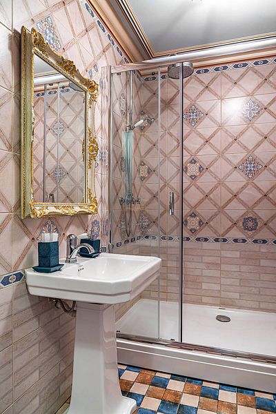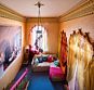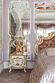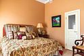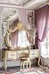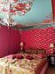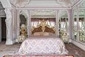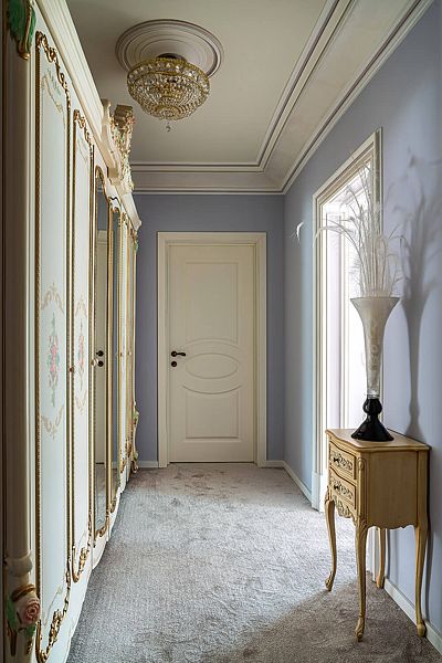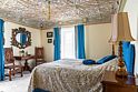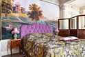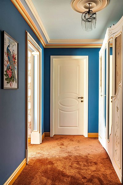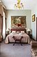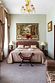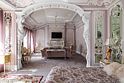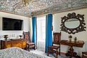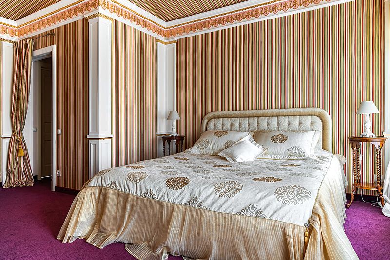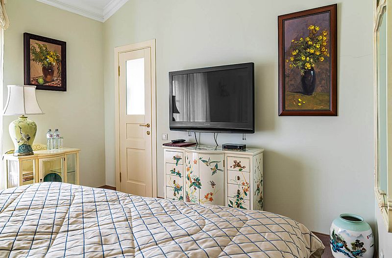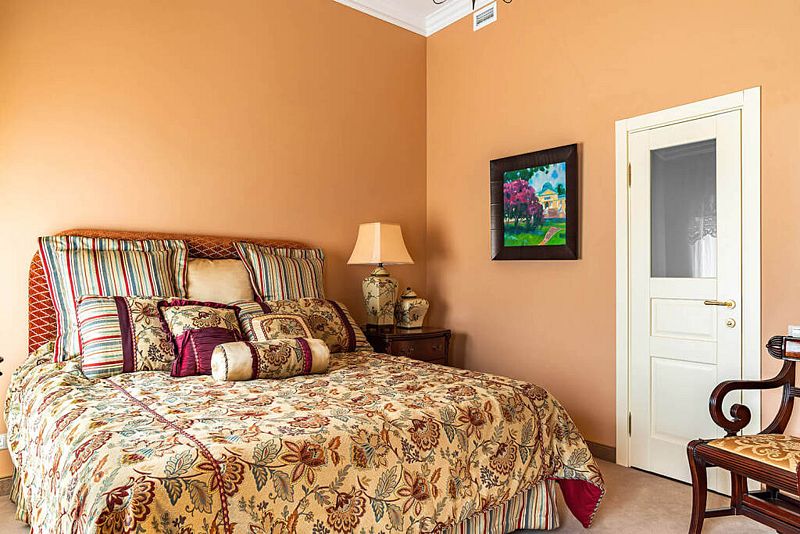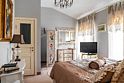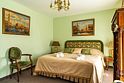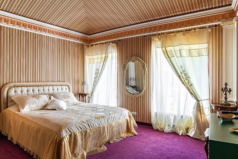Небольшая по размеру, но очень изящная, гармоничная гостевая комната для двоих. Светлые тона в декоре, картины, резная мебель, но главная и притягивающая к себе внимание деталь — это лепной узорчатый потолок, собравший в себя все цвета комнаты.