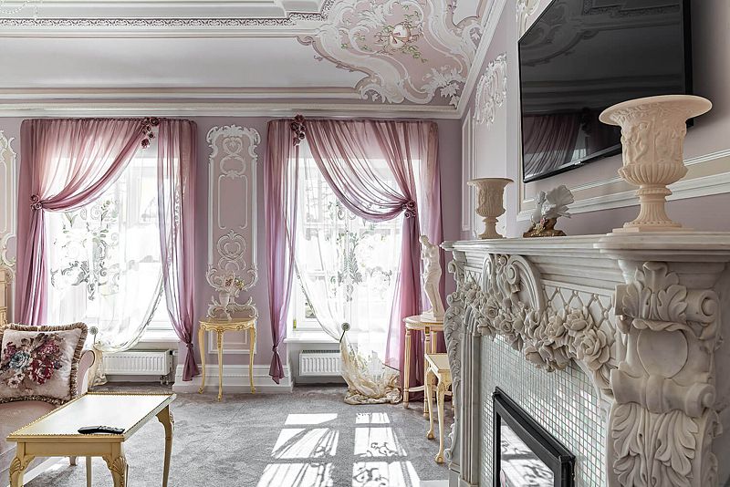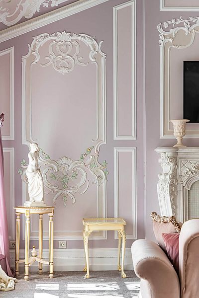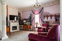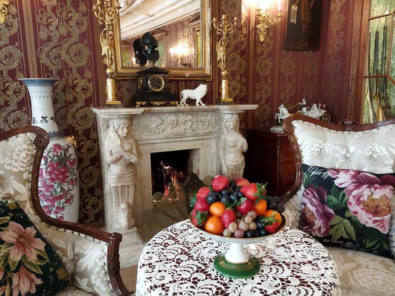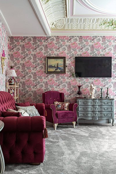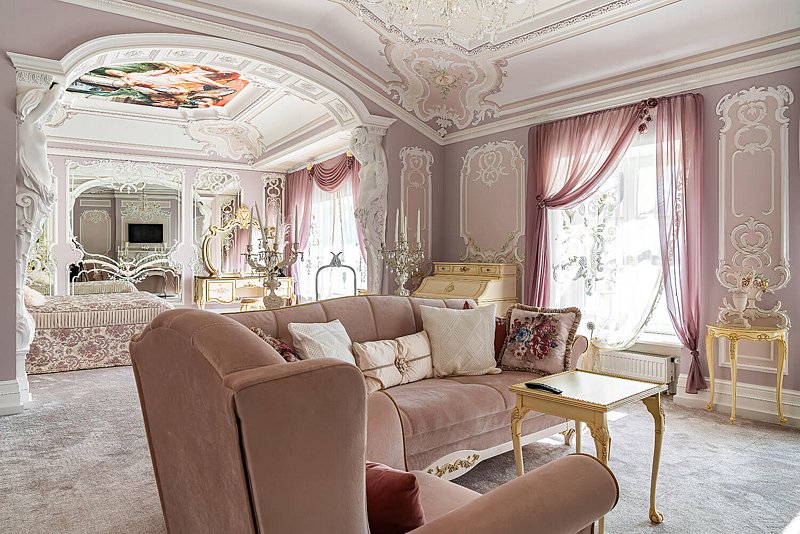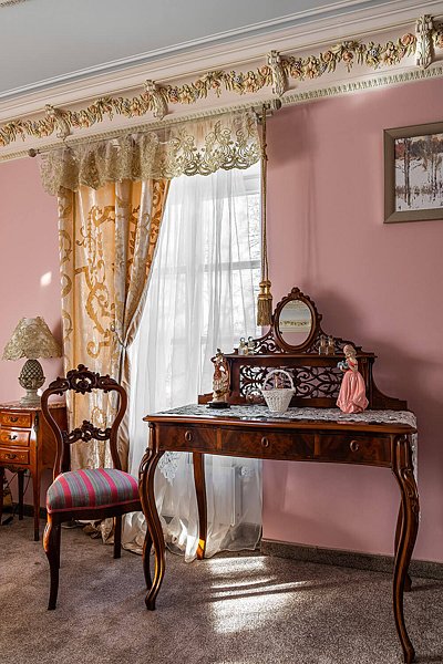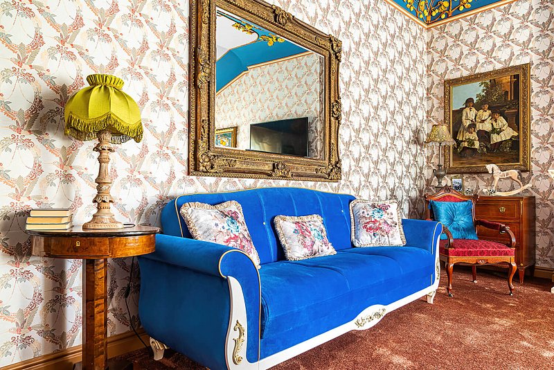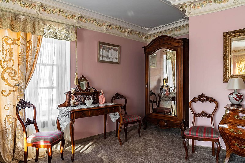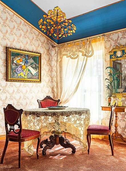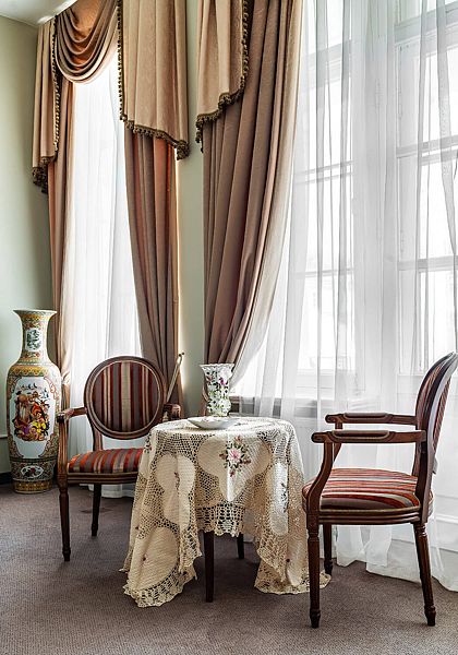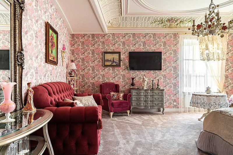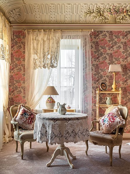 Цветы и фрукты, собранные в корзинки, во всём: в рисунке обоев, в необыкновенной лепнине потолка, в элегантном декоре люстры и светильников. Столик, накрытый кружевной скатертью и два кресла с обивкой-вышивкой крестиком. Комната, наполненная домашним уютом и ностальгией.