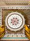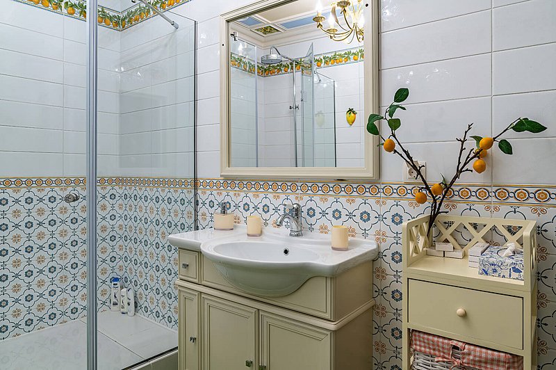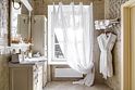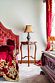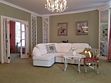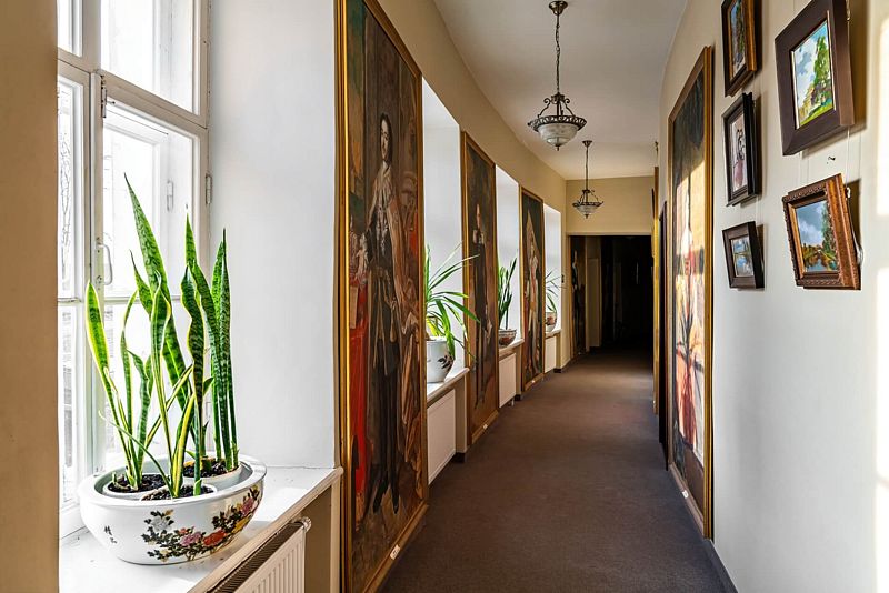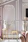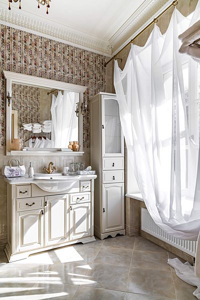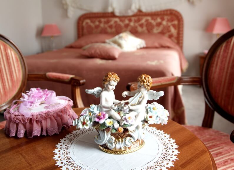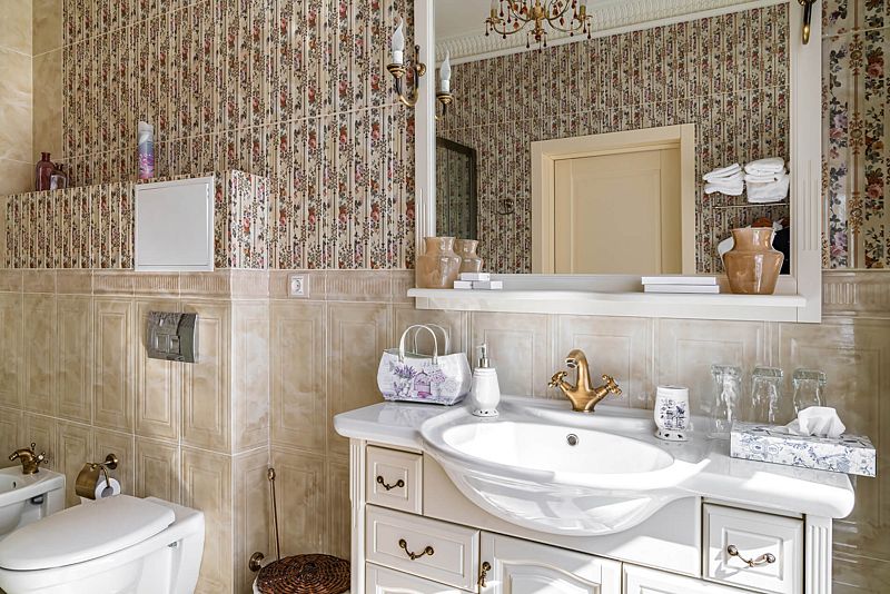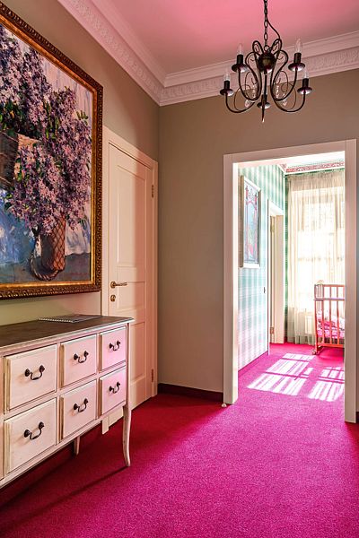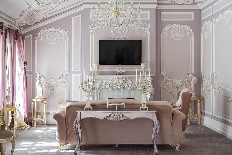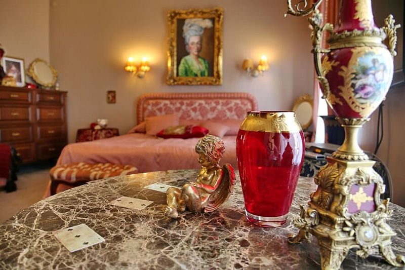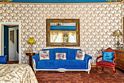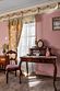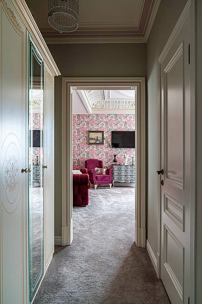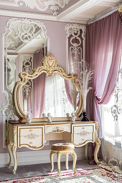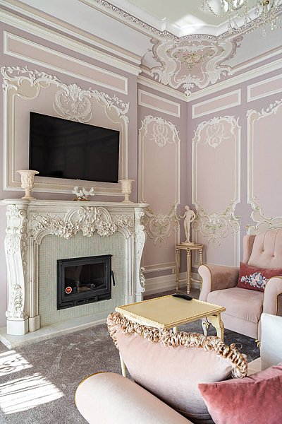 Цветы и фрукты, собранные в корзинки, во всём: в рисунке обоев, в необыкновенной лепнине потолка, в элегантном декоре люстры и светильников. Столик, накрытый кружевной скатертью и два кресла с обивкой-вышивкой крестиком. Комната, наполненная домашним уютом и ностальгией.