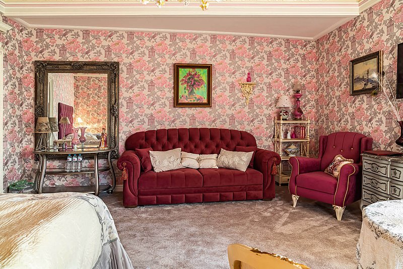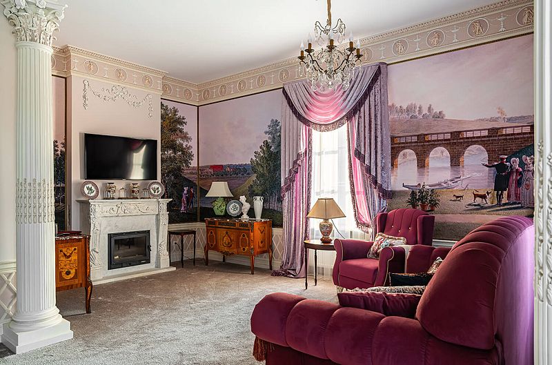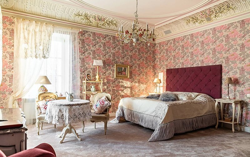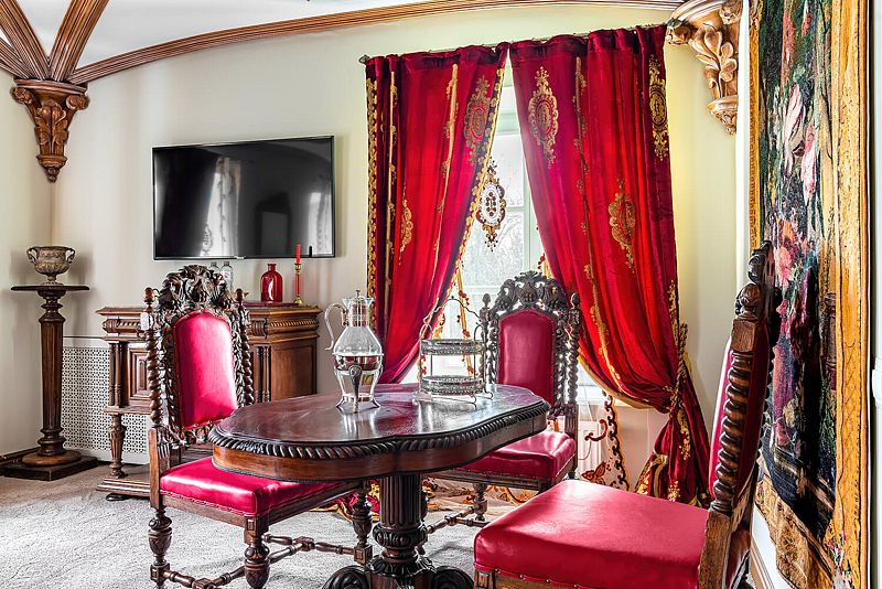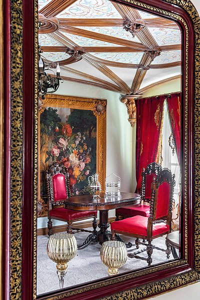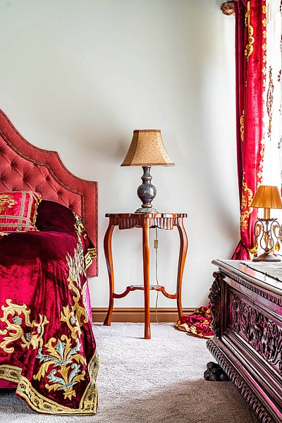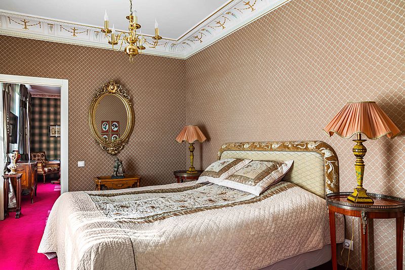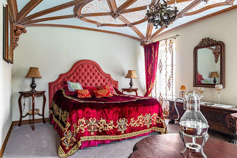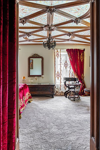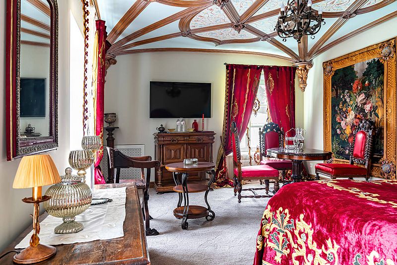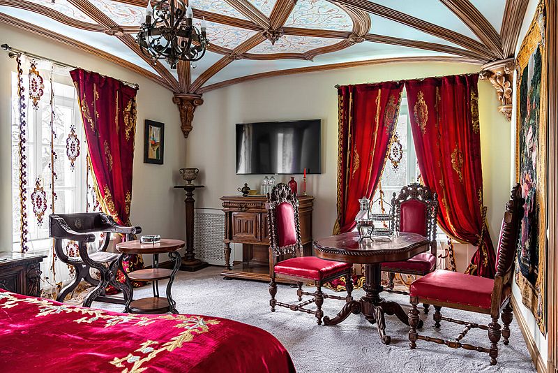 Атмосфера старинного европейского замка: антикварная мебель, зеркала, картины, гобелены, светильники и кованая люстра. Но главная изюминка этой комнаты — сводчатый потолок с потрясающим геометрическим рисунком. Тёмное дерево, насыщенный бордовый цвет ткани в покрывалах и шторах и чудесный вид на старинный Английский парк — никого не оставит равнодушным.