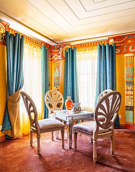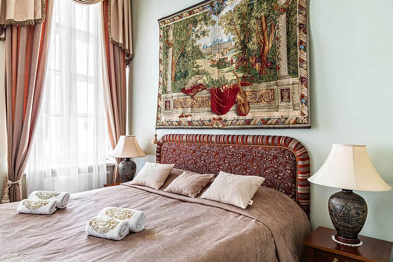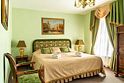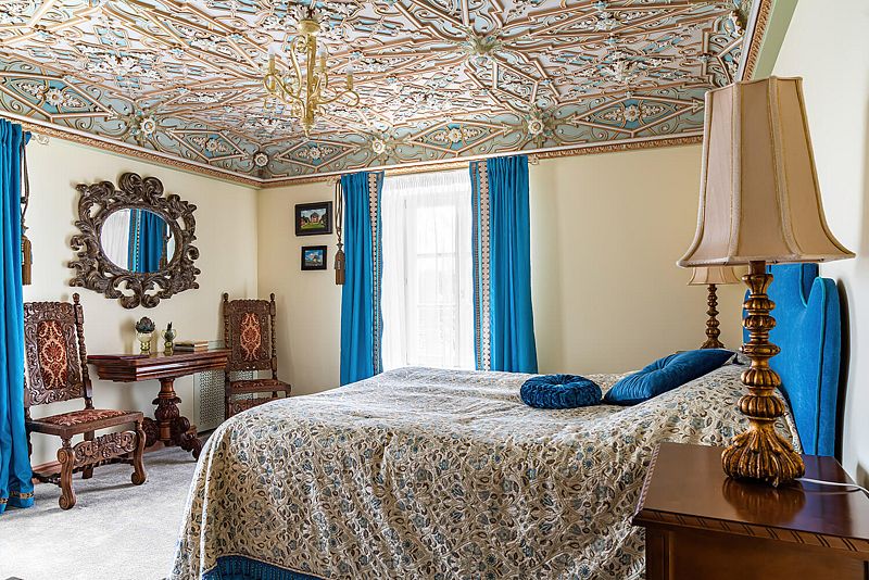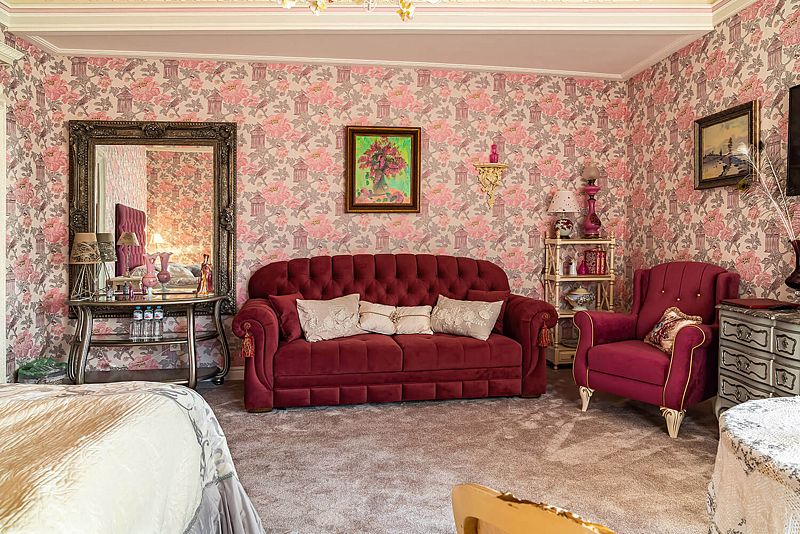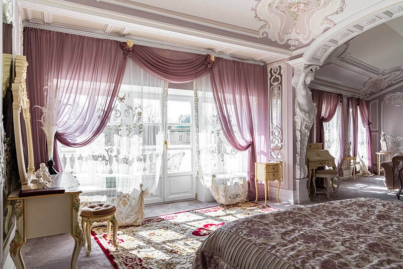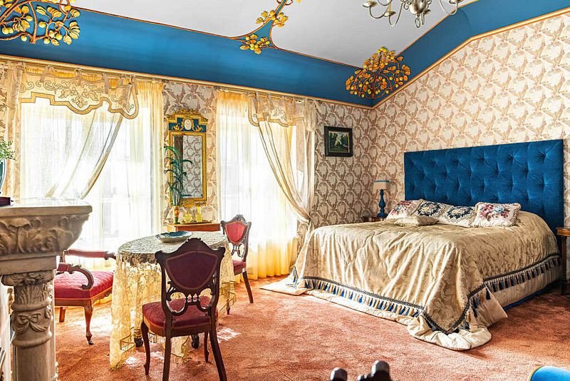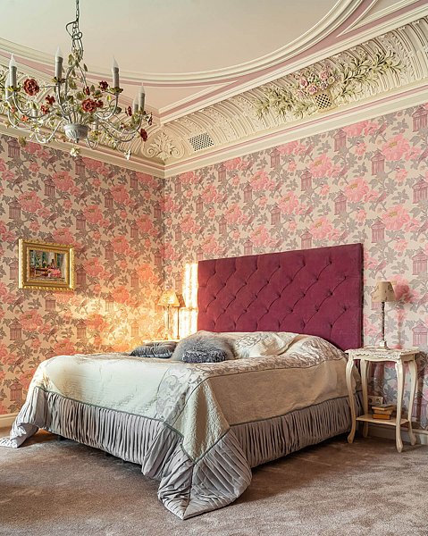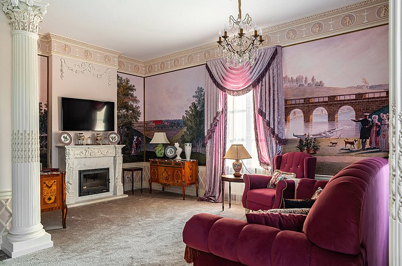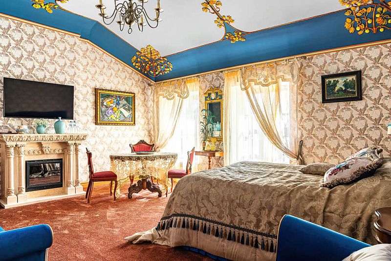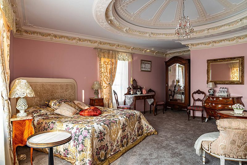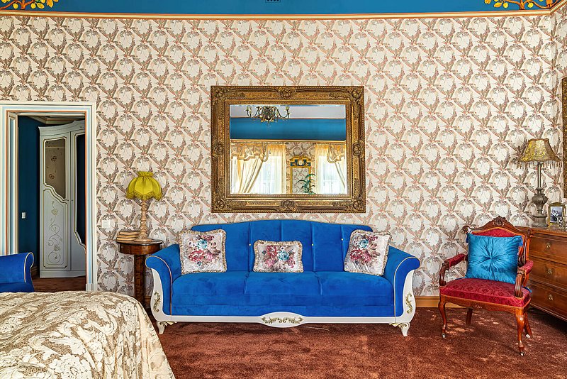 Атмосфера старинного европейского замка: антикварная мебель, зеркала, картины, гобелены, светильники и кованая люстра. Но главная изюминка этой комнаты — сводчатый потолок с потрясающим геометрическим рисунком. Тёмное дерево, насыщенный бордовый цвет ткани в покрывалах и шторах и чудесный вид на старинный Английский парк — никого не оставит равнодушным.