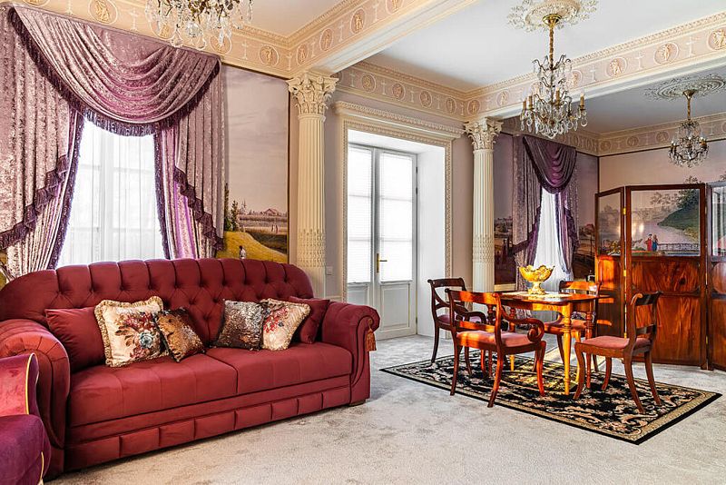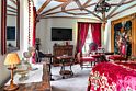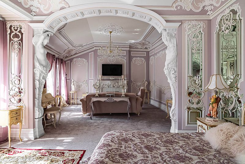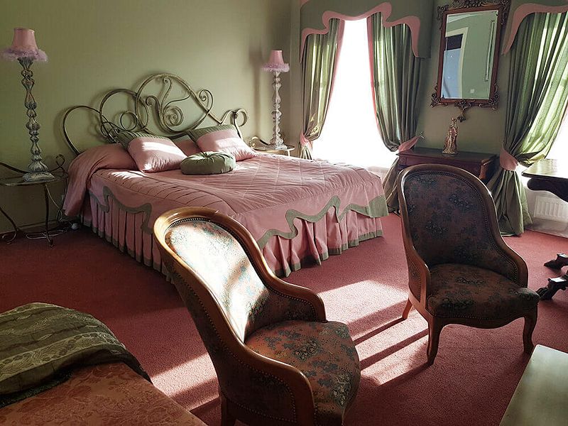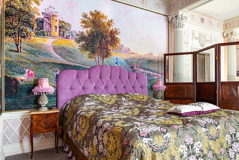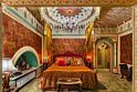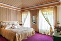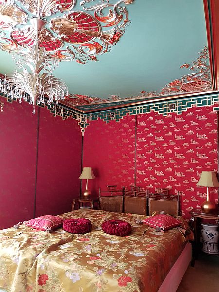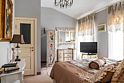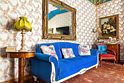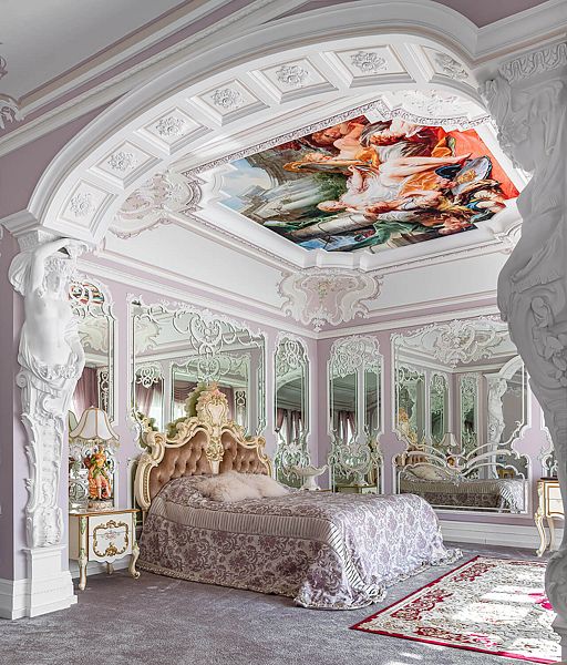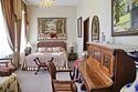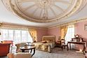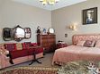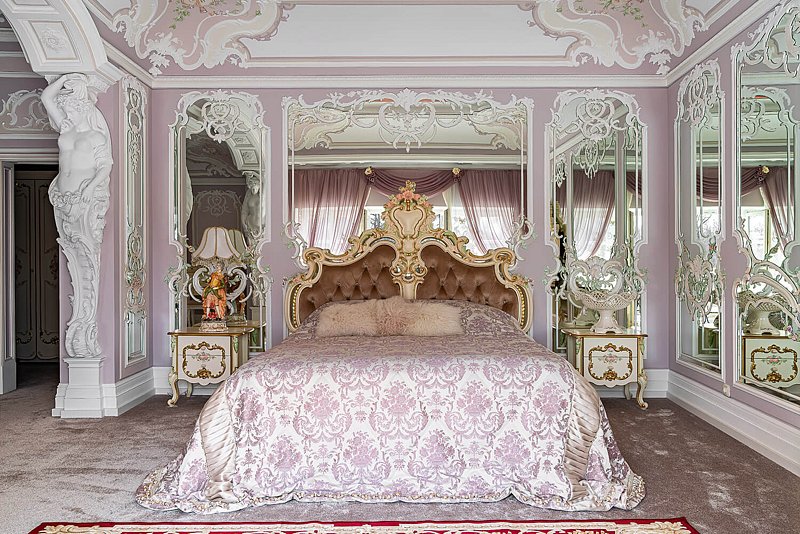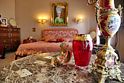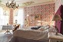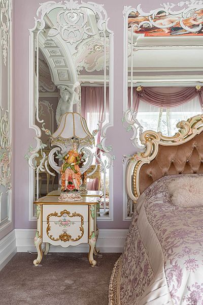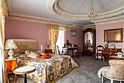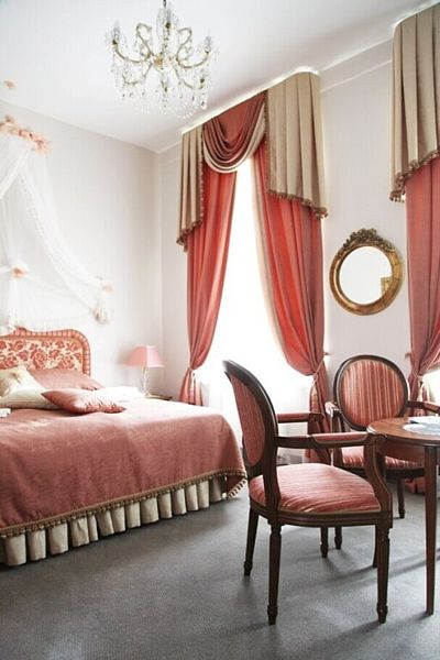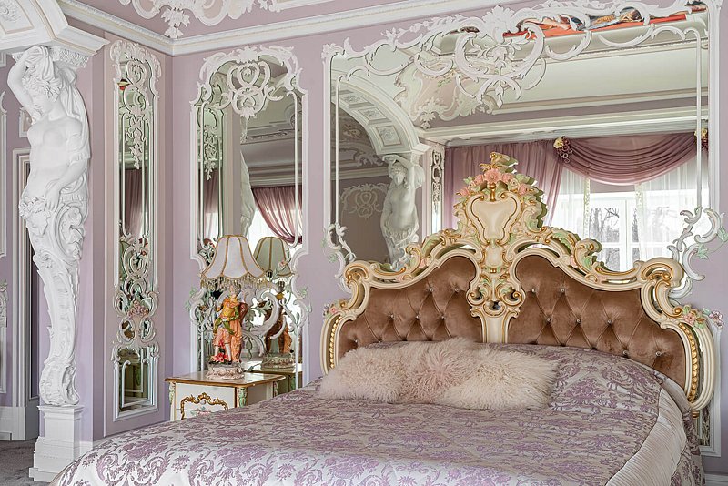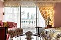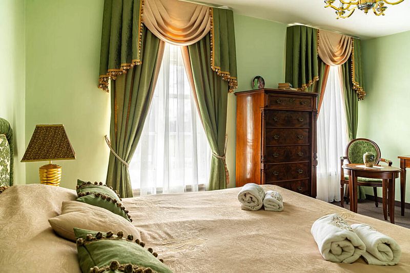 Атмосфера старинного европейского замка: антикварная мебель, зеркала, картины, гобелены, светильники и кованая люстра. Но главная изюминка этой комнаты — сводчатый потолок с потрясающим геометрическим рисунком. Тёмное дерево, насыщенный бордовый цвет ткани в покрывалах и шторах и чудесный вид на старинный Английский парк — никого не оставит равнодушным.