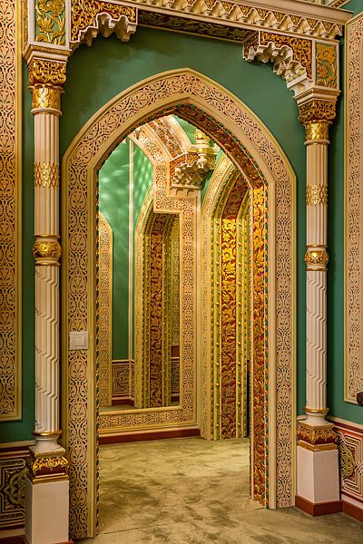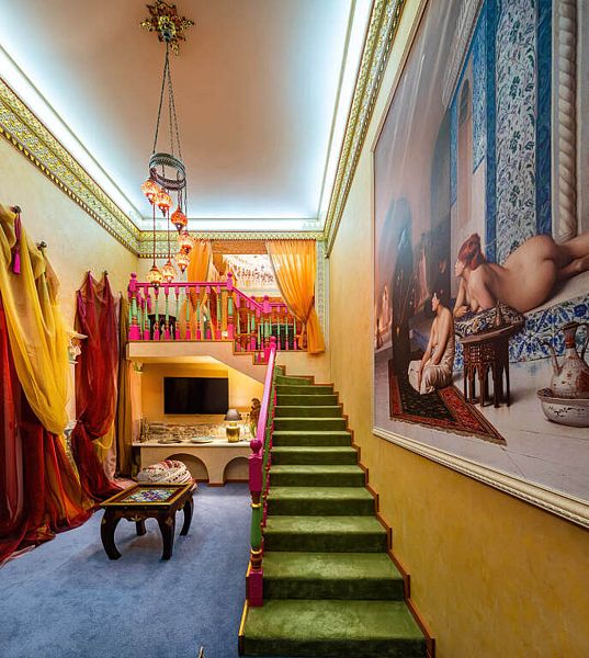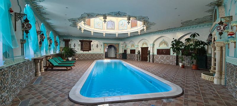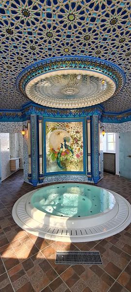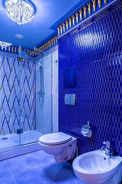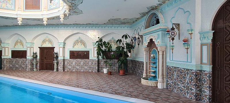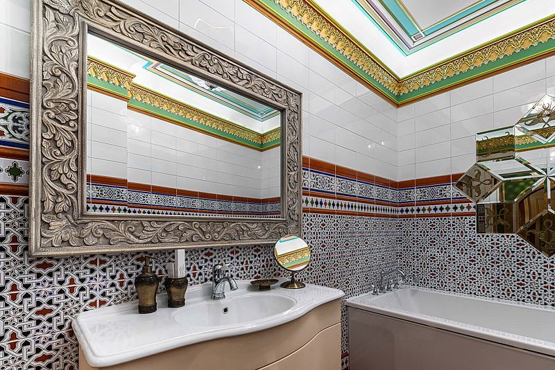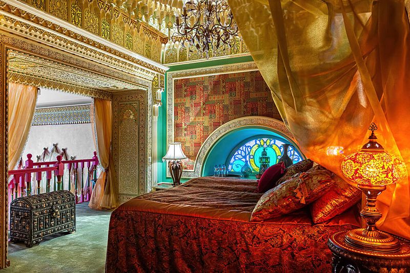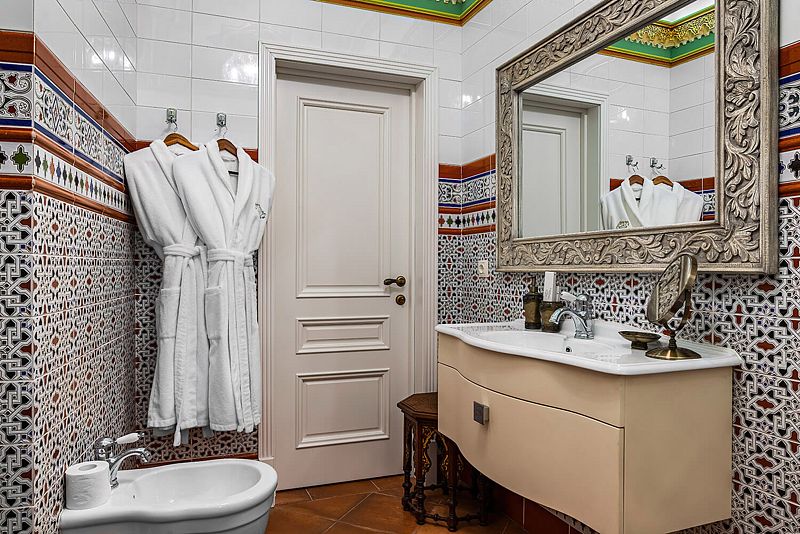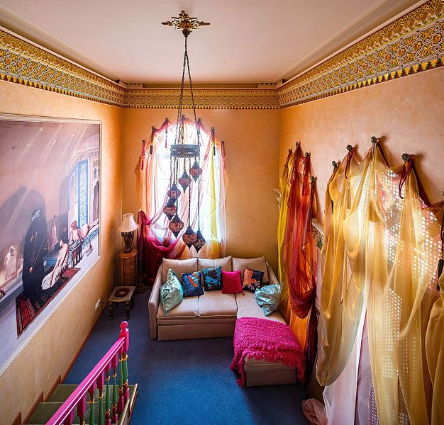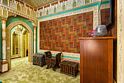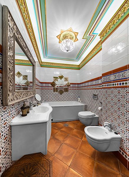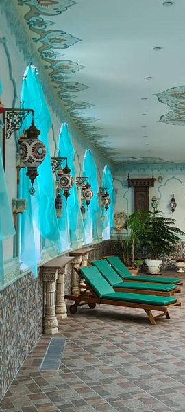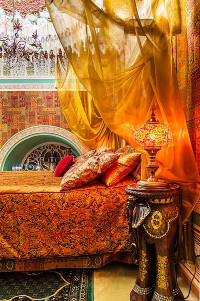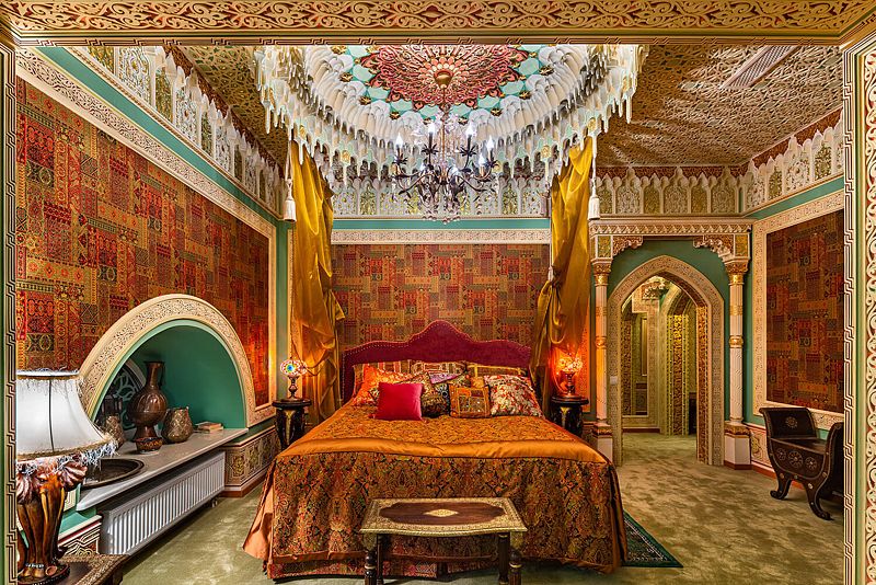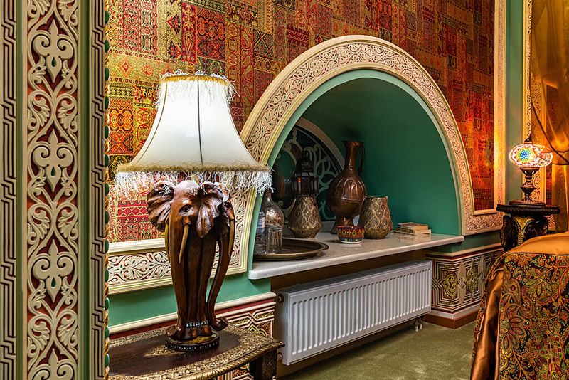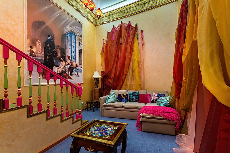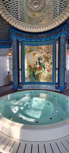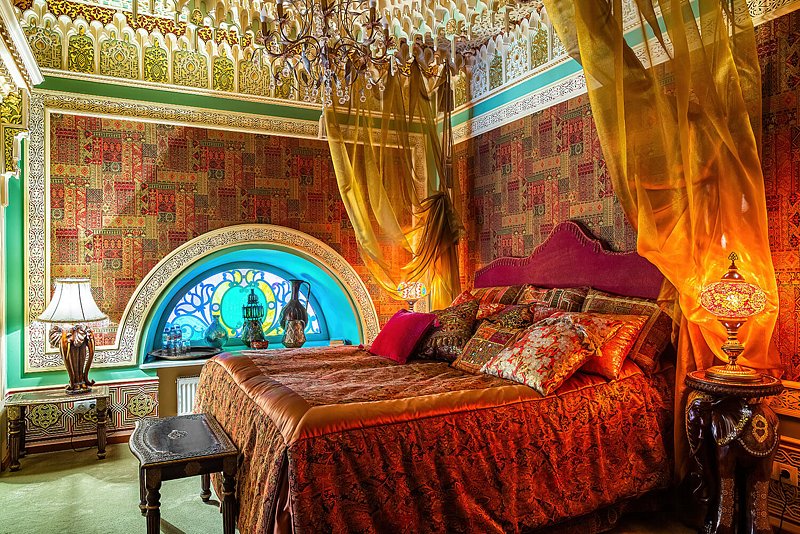 Двухуровневые апартаменты. Этнический дизайн, самобытность, смешение различных культур и импровизация — главная особенность оформления этого фантастического номера. Арочные окна и ниши в стенах, восточный узор в настенных панно, ручная роспись арабских узоров и орнаментов, балдахин над королевской кроватью — неповторимый колорит востока поражает каждого. Куполообразный потолок ручной лепки и росписи — настоящий шедевр этих апартаментов. Воздушность номеру придаёт ткань — лёгкая, струящаяся и переливающаяся всеми цветами и красками удивительной страны — Марокко.