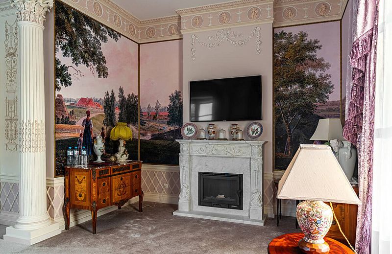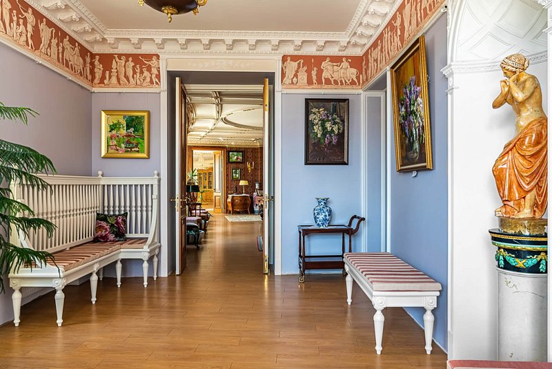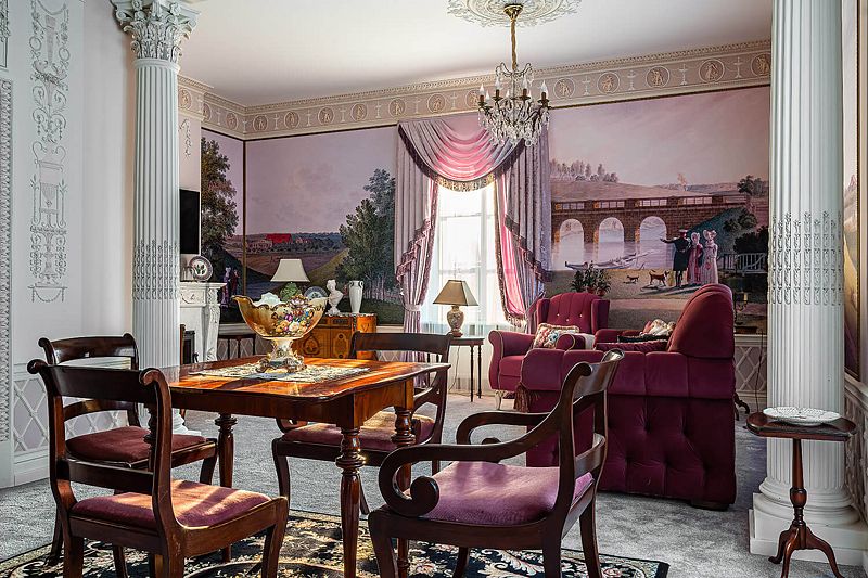 Настенные панно, изготовленные по историческим акварелям домашнего художника семьи Строгановых — Есакова Е.И. — главное украшение этих апартаментов. Зелёные рощицы, бескрайние поля, старинные мосты, водная гладь реки Тосны и прудов, водопады… и на фоне этой идиллии –люди: господа и простые крестьяне. Усадебная жизнь 19 века во всей своей красе.