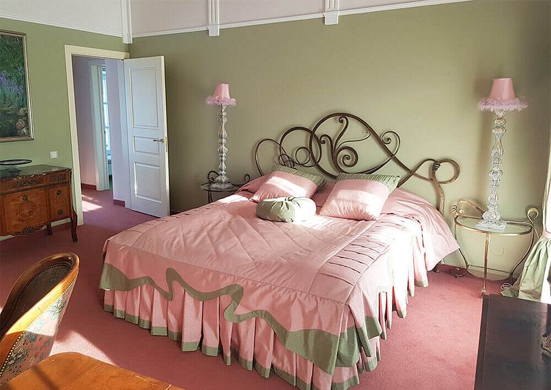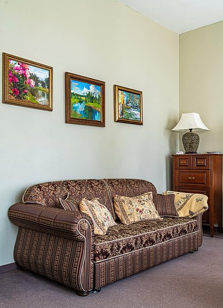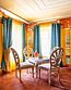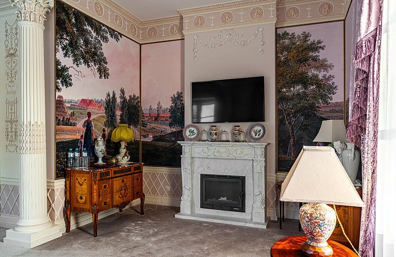 Именно мотив ирисов и других весенних цветов является центральным в интерьере этого номера. Соответствующим образом подобраны цвета: основу палитры составляют нежные оттенки - такие же свежие и светлые, как сама весна. А на стенах можно увидеть картины из художественной коллекции усадьбы с изображением этих растений.