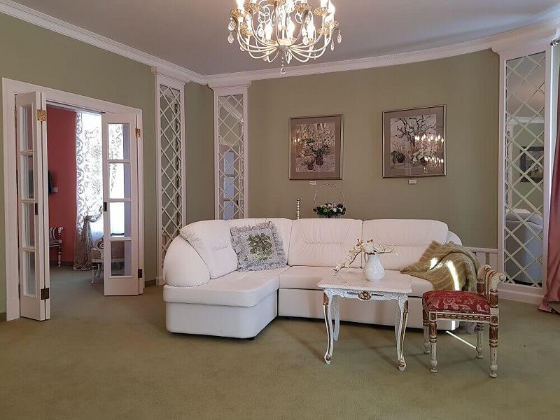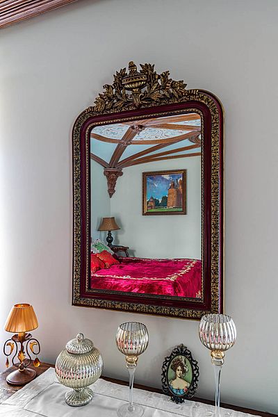 К вашим услугам — просторные комфортабельные помещения, стены которых украшены произведениями из художественной коллекции усадьбы и предметами старины, элегантно вписавшимися в сегодняшний день. Среди последних — например, вот это старинное зеркало, сделанное из оконной рамы.