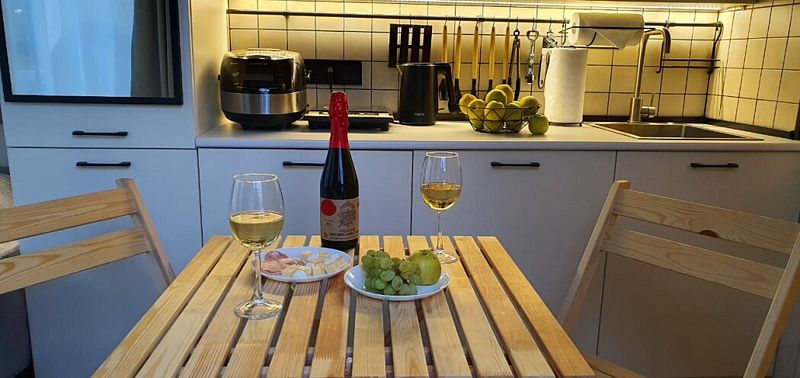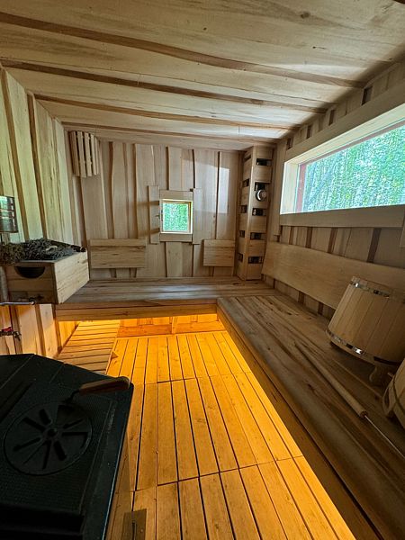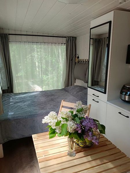 В доме обеспечено все для комфортной жизни: двуспальная кровать шириной 160 см с панорамным окном на лес; кухонная зона с раковиной, подсветкой рабочего пространства, мини-холодильником, электрическим чайником, индукционной плитой, мультиваркой, СВЧ-печью, полным набором посуды, вытяжкой, всем необходимым для приготовления пищи; шкаф для хранения вещей и одежды; санузел с душевой кабиной, унитазом, раковиной, феном для волос, гелем для душа.