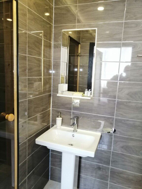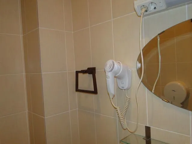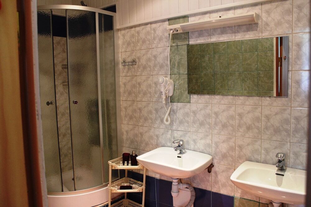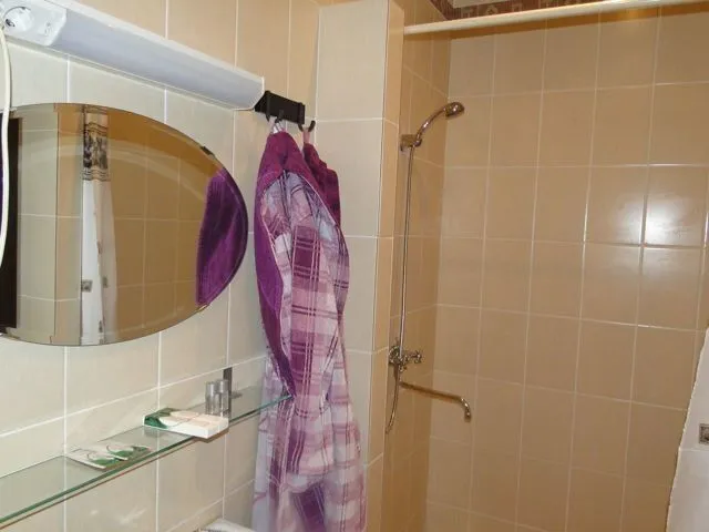 В номере: две кровати (есть номер с одной двуспальной кроватью), шкаф, тумбочка, телевизор, кофеварка, холодильник, туалет и душ.