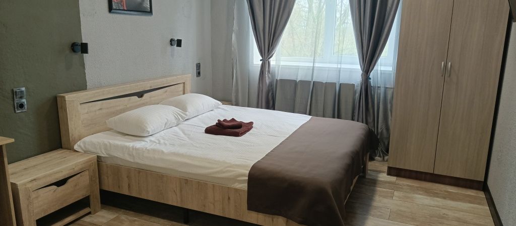 Просторный,двухкомнатный, прекрасно меблированный номер с уютной гостиной, спальней и ванной комнатой. Идеально подходит для работы и полноценного отдыха. В номере две кровати, два LED телевизора, шкаф, персональная ванная комната, фен,мини-холодильник,халаты, набор ванных принадлежностей,тапочки