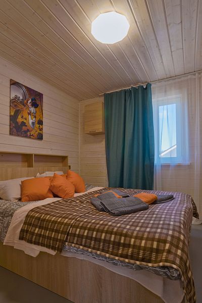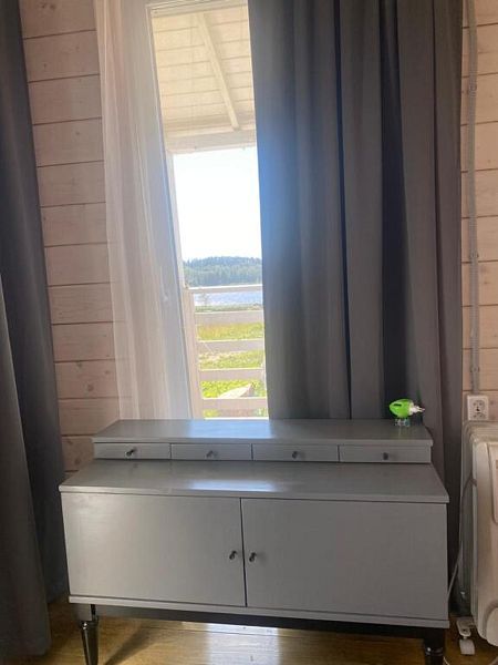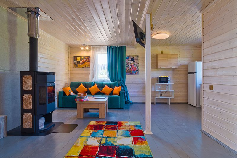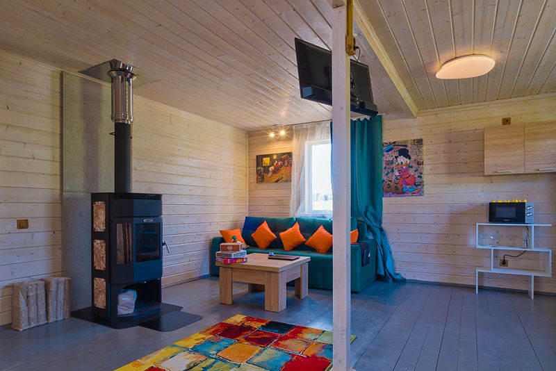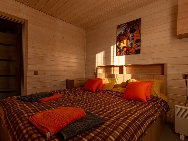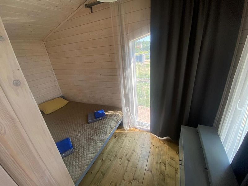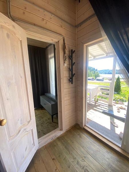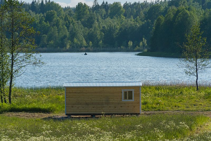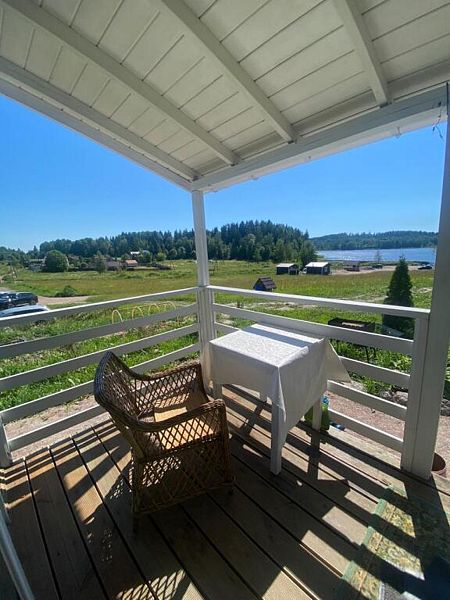 Дом на двоих человек с большой террасой, с которой открывается красивый вид на озеро. В доме одна двуспальная кровать, гостиная-кухня, душевая и туалет.