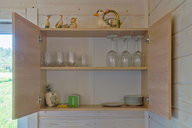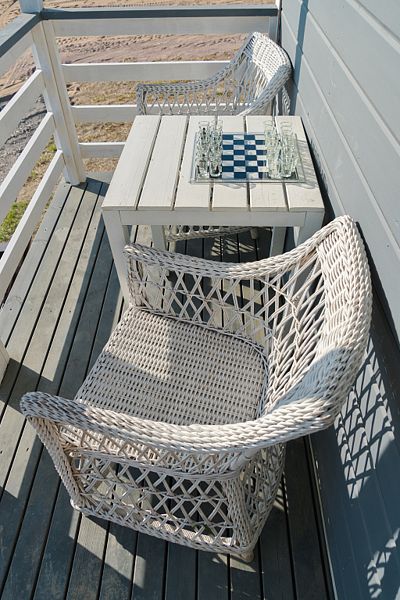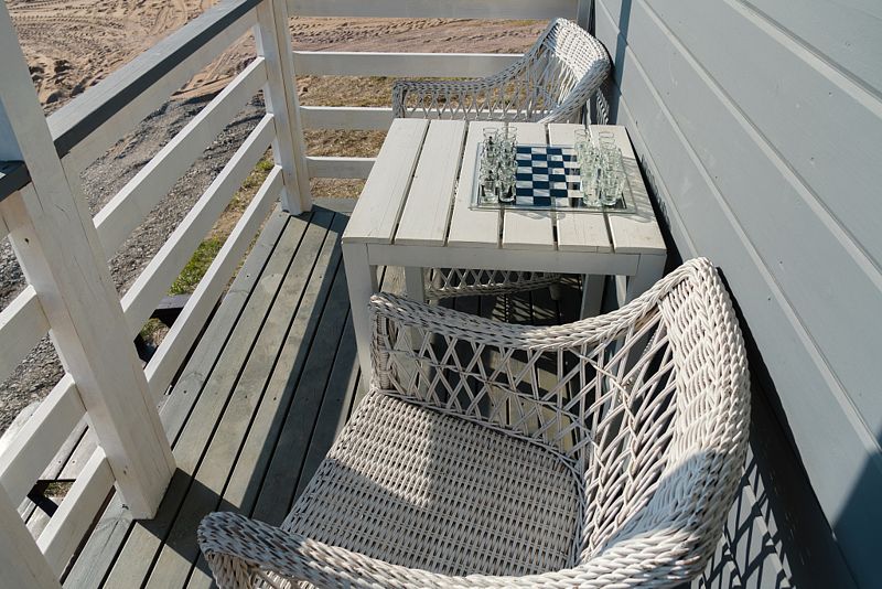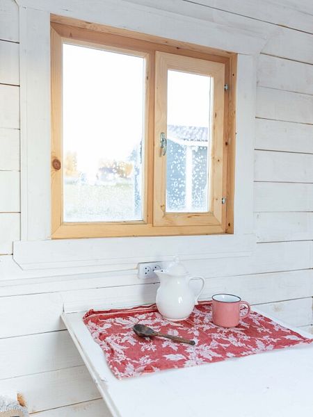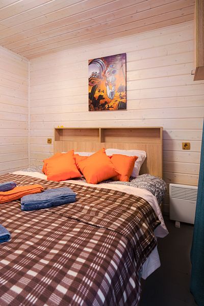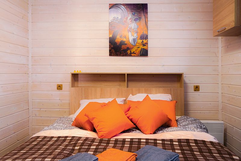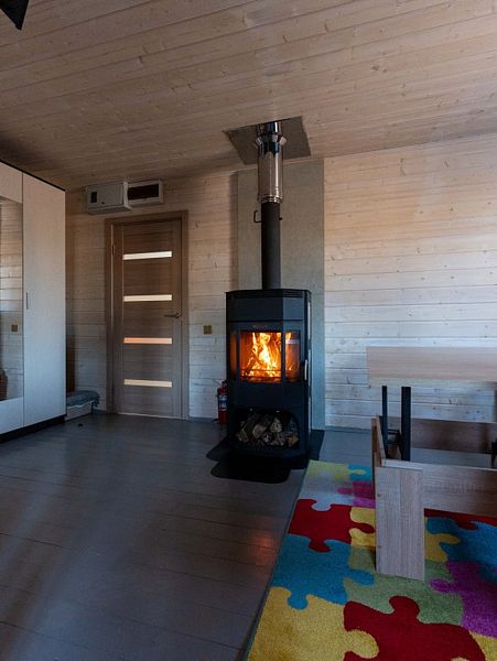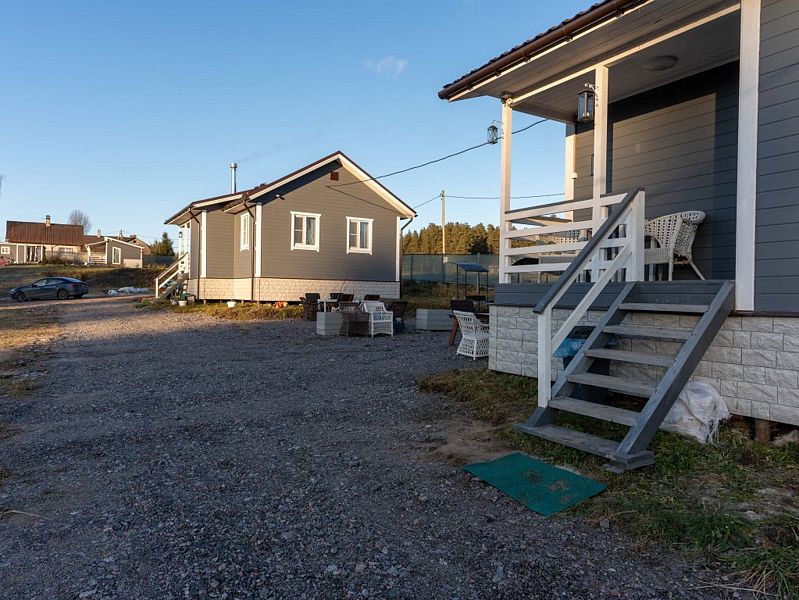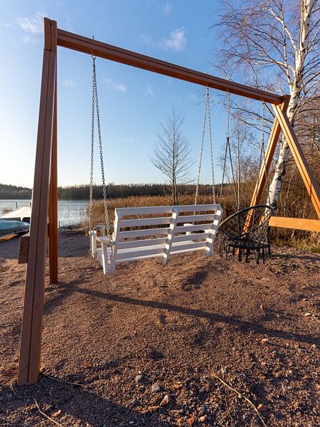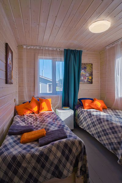 Дом на двоих человек с большой террасой, с которой открывается красивый вид на озеро. В доме одна двуспальная кровать, гостиная-кухня, душевая и туалет.