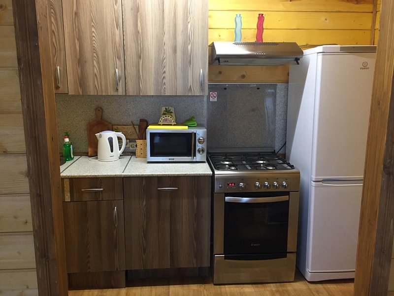В коттедже имеются три комнаты, рассчитанные на размещение 5 гостей: две комнаты с видом на реку, одна - с видом на лес. Кухня оборудована всей необходимой бытовой техникой. Имеются два дополнительных спальных места. горячая вода круглосуточно.