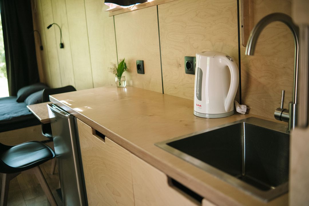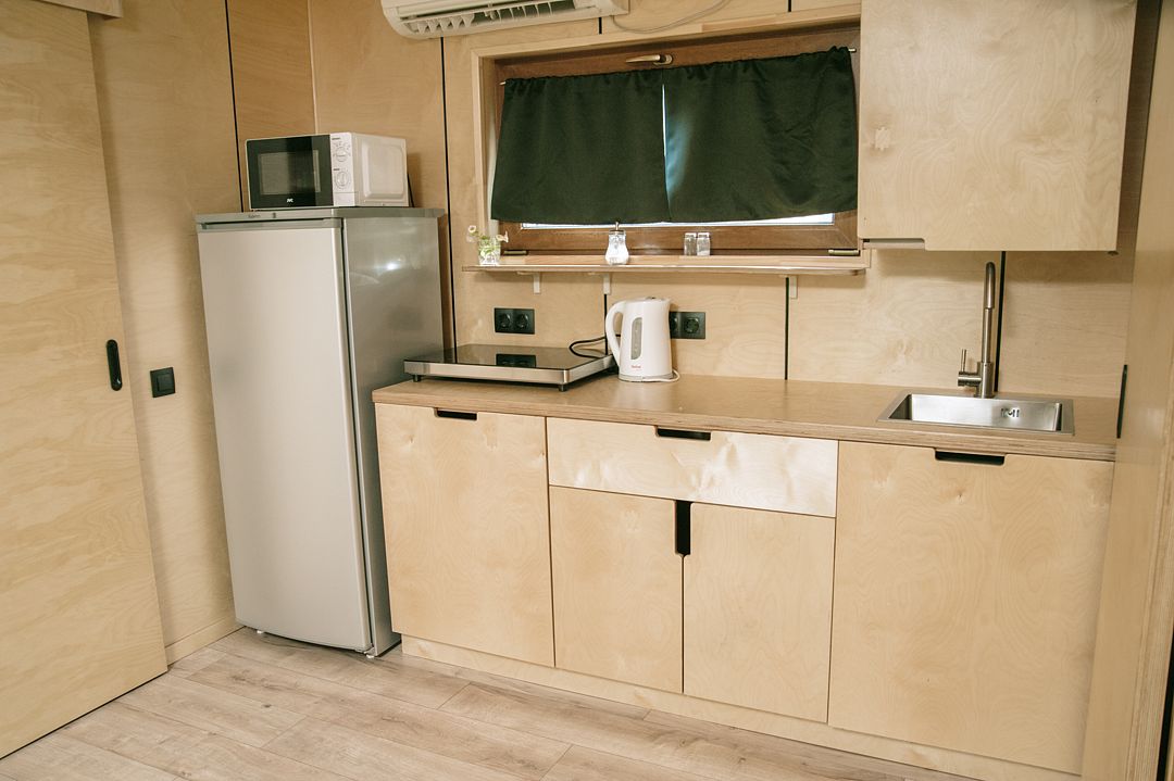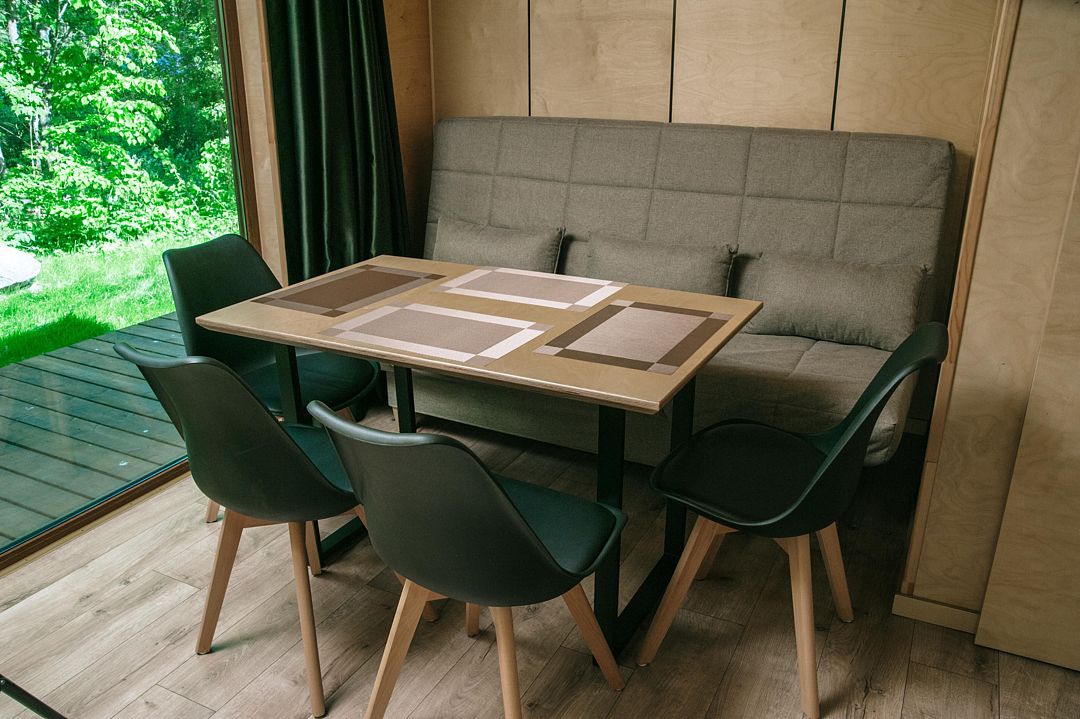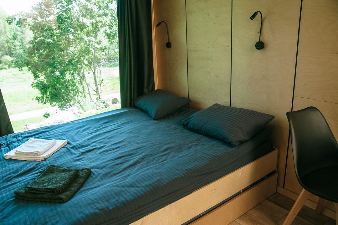 В доме с панорамными окнами объединенная спальня-гостиная с комфортной двуспальной кроватью, отдельная ванная комната с душем и туалетом, кухня полностью оборудована техникой и посудой, открытая терраса с удобной мебелью и мангалом