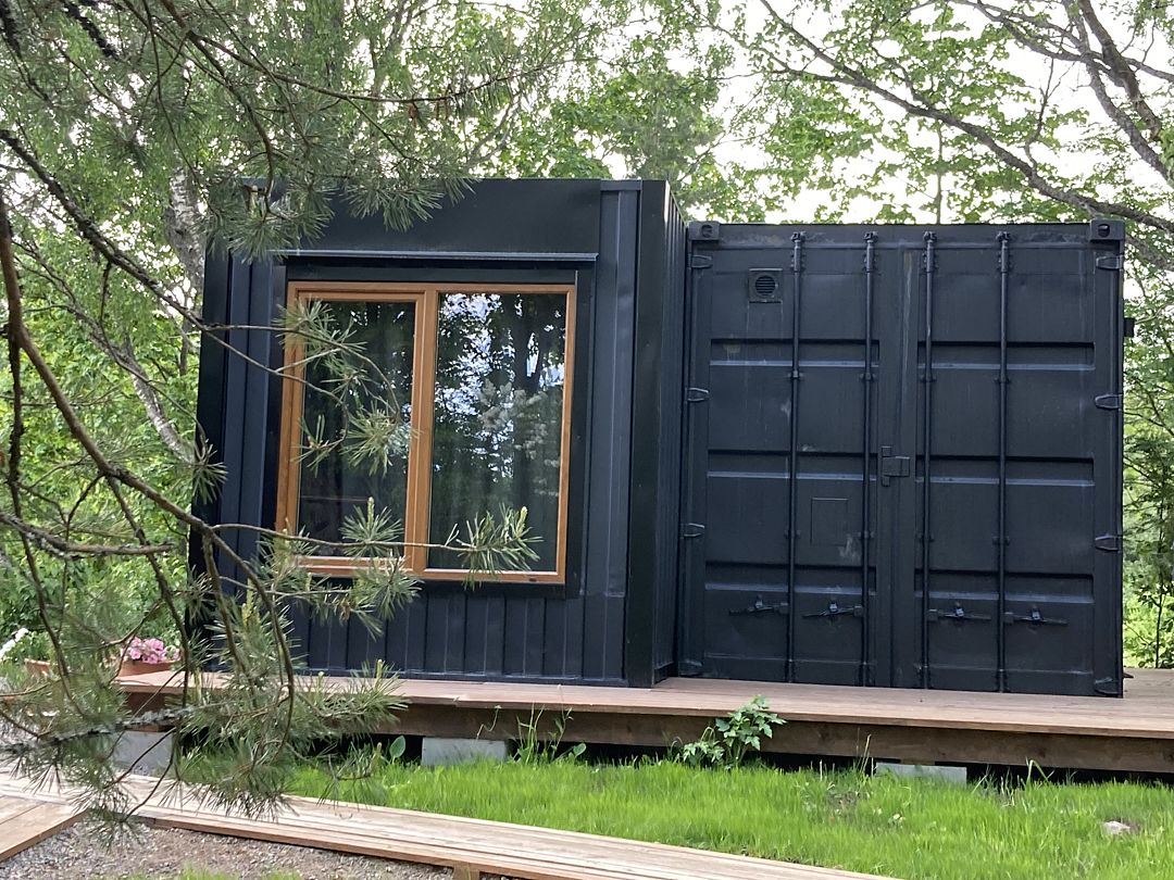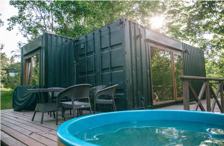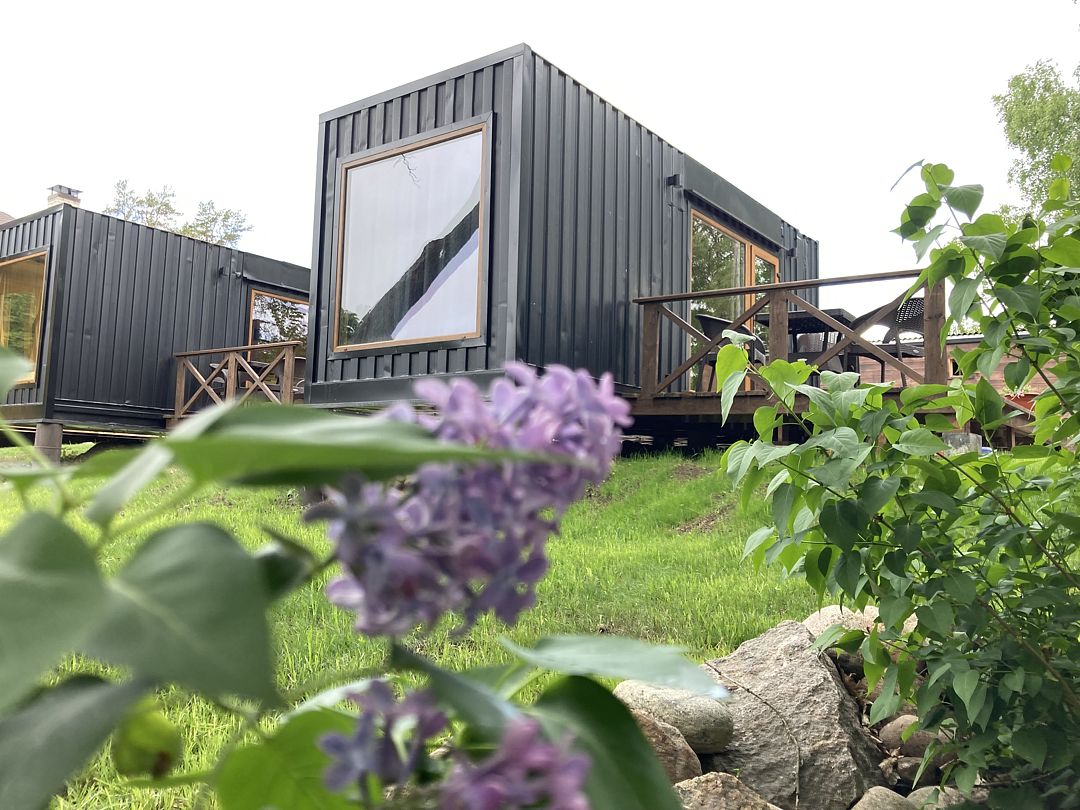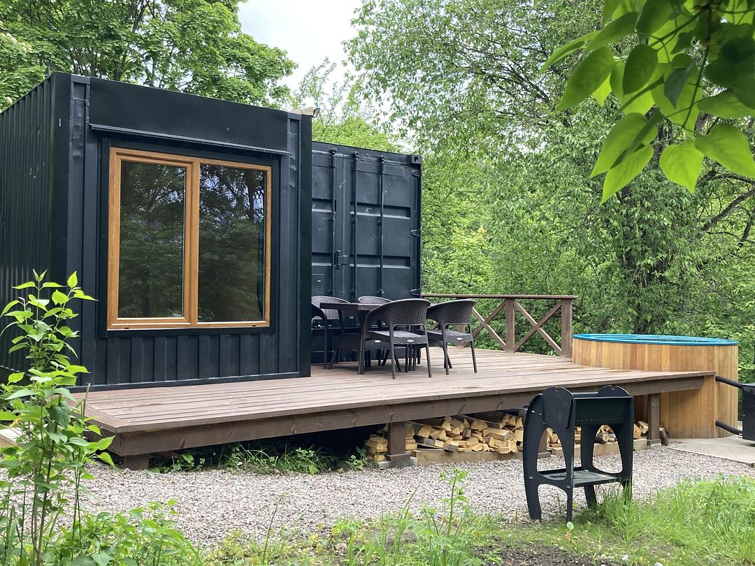 Уединенный комфортный дом-контейнер для семьи или компании до 6-ти человек с двумя спальнями, большой кухней-гостиной и теплой купелью на большой открытой террасе