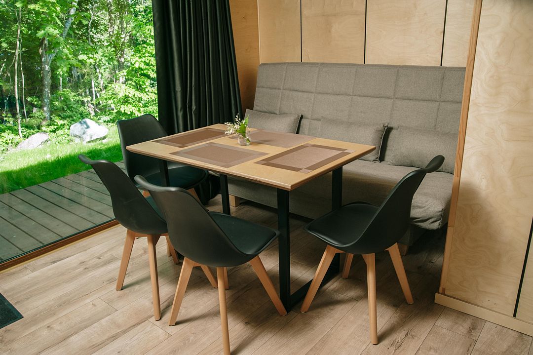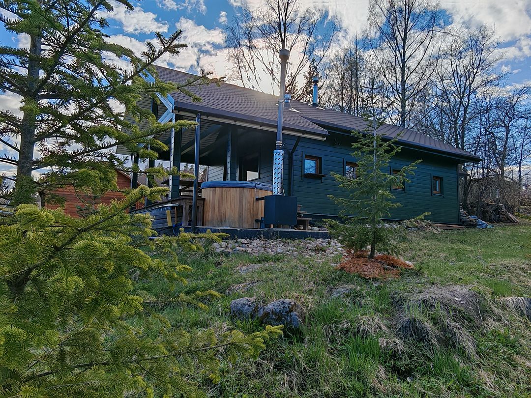 В доме с панорамными окнами объединенная кухня-гостиная с удобным двухместным диваном, две отдельные спальни с комфортными двуспальными кроватями, отдельная ванная комната с душем и туалетом, кухня полностью оборудована техникой и посудой, открытая терраса с мебелью и подогреваемой купелью