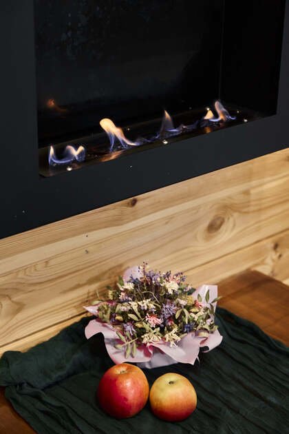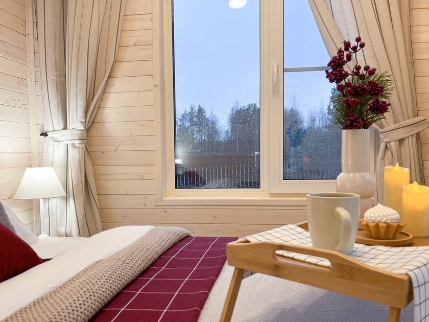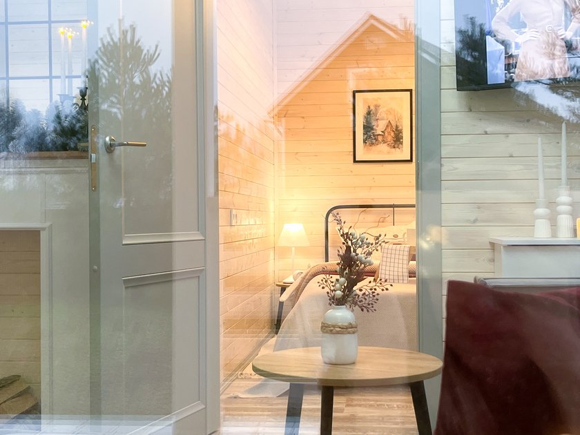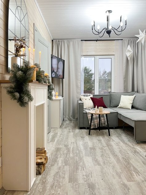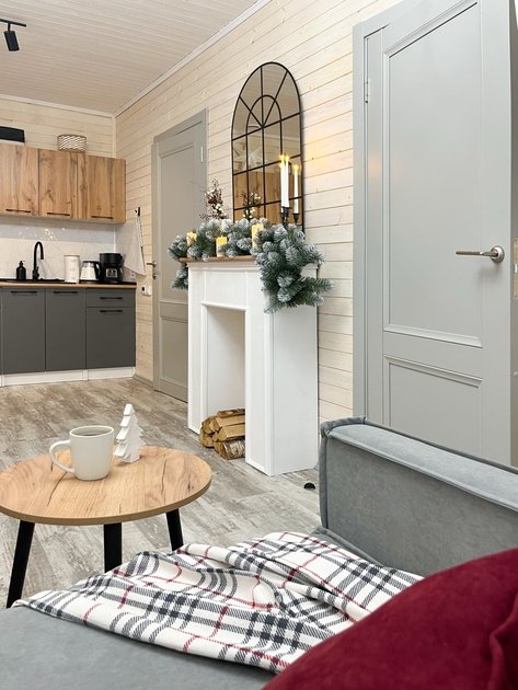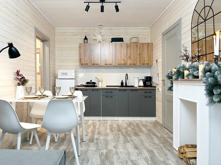Допускается заселение с небольшими собаками до 30 см в Дом с сауной у залива и в Сканди дом с фотозонами и сауной у залива.
