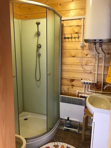 В доме есть всё необходимое - холодильник, микроволновка, стиральная машина, теплый пол, плита, телевизор, душевая кабина. Отопление - электрический котел, также есть камин. Дом очень тёплый.
