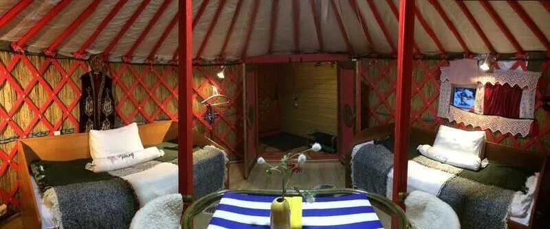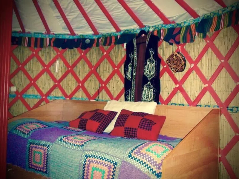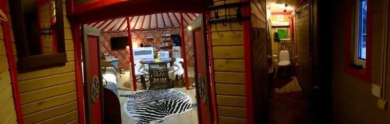 Это романтическое место для проживания двух персон. В юрте есть все необходимое для комфортного проживания. Кулер с горячей и холодной водой, микроволновая печь, холодильник, тостер, электрическая плитка. Душ и санузел. Телевидение и интернет бесплатно.