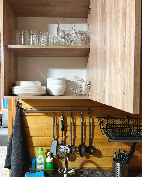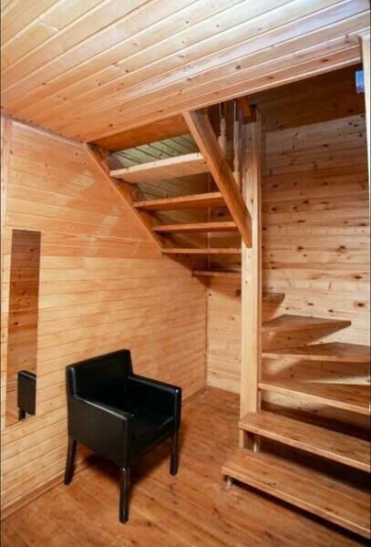 Домик двухэтажный, внизу санузел и кухня-гостиная, наверху две спальни. Между ними довольно крутая полувинтовая деревянная лестница. С маленьким ребенком я бы точно не рискнула жить с такой — я и сама один раз там в носках умудрилась проехаться по ступенькам. Ну и ночью в туалет — спускаешься-поднимаешься. Плюс в том, что свет на лестнице можно включить как внизу, так и наверху.