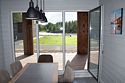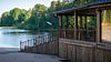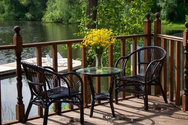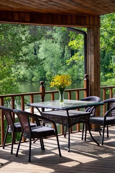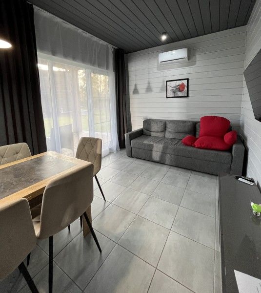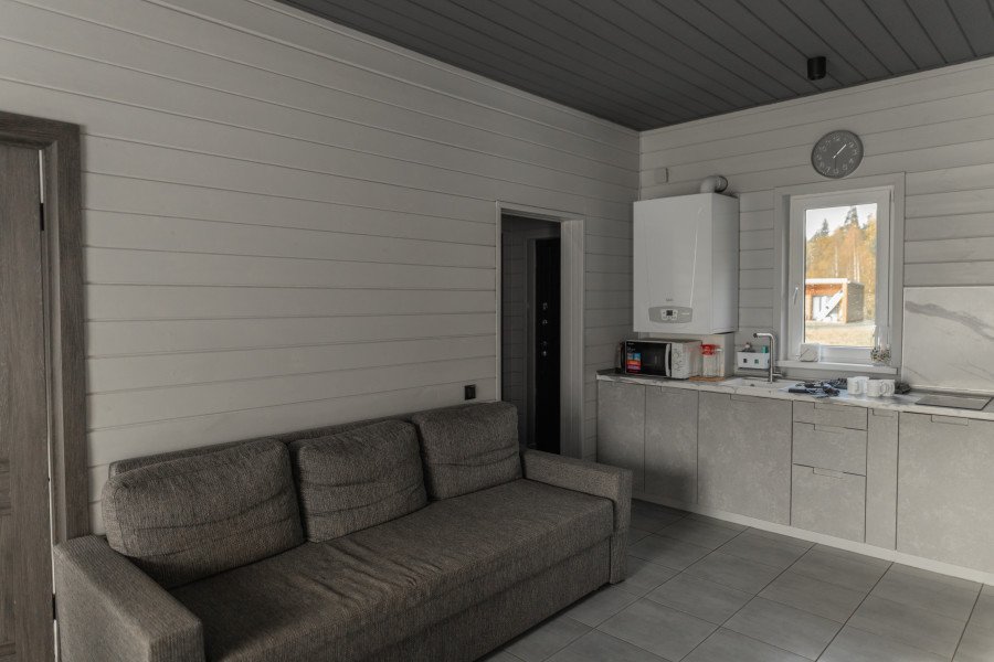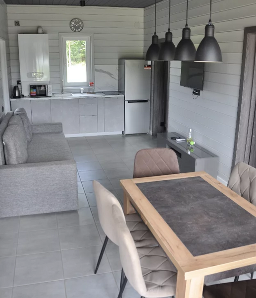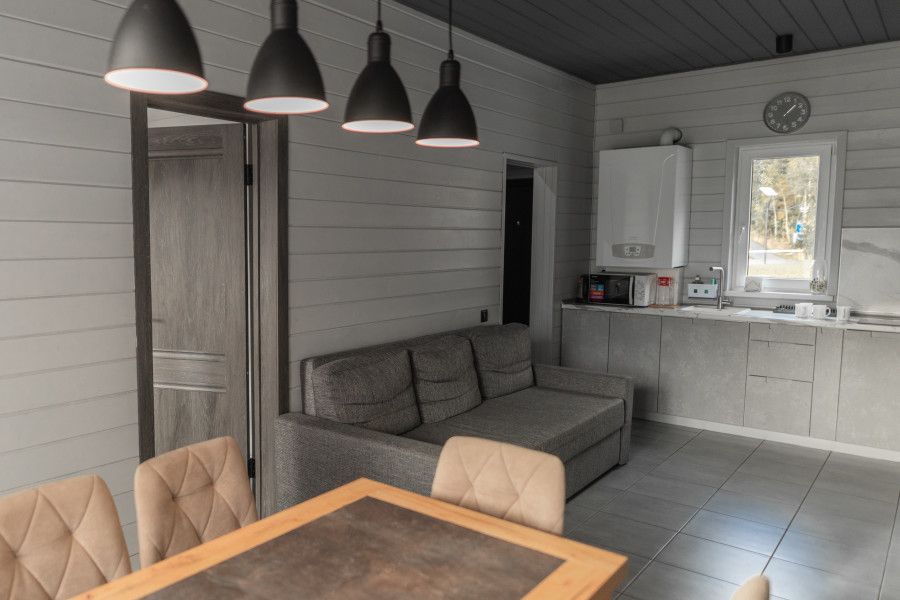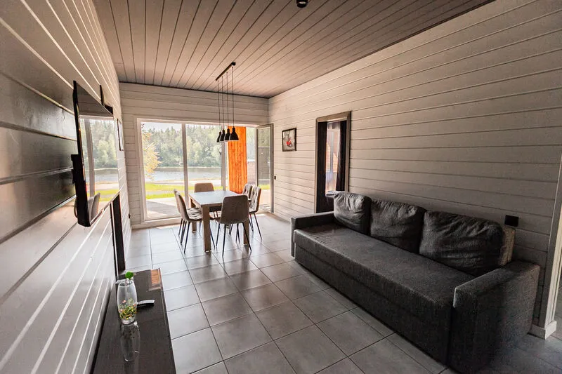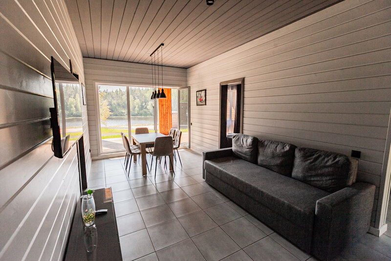 Уютный домик из трёх комнат, с гостиной и террасой с видом на озеро.