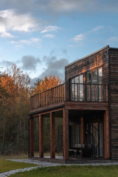 Уютный двухэтажный домик из четырёх комнат, с гостиной и двумя террасой с видом на озеро.
